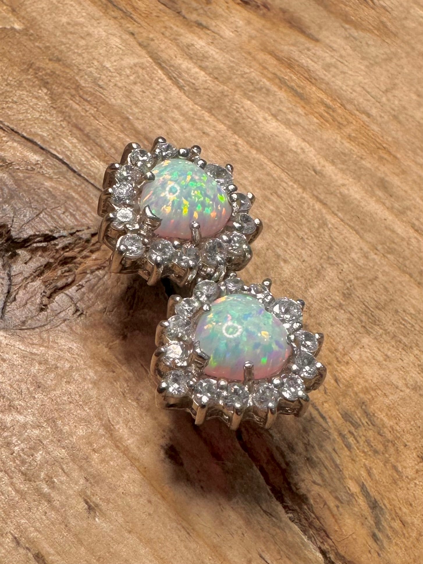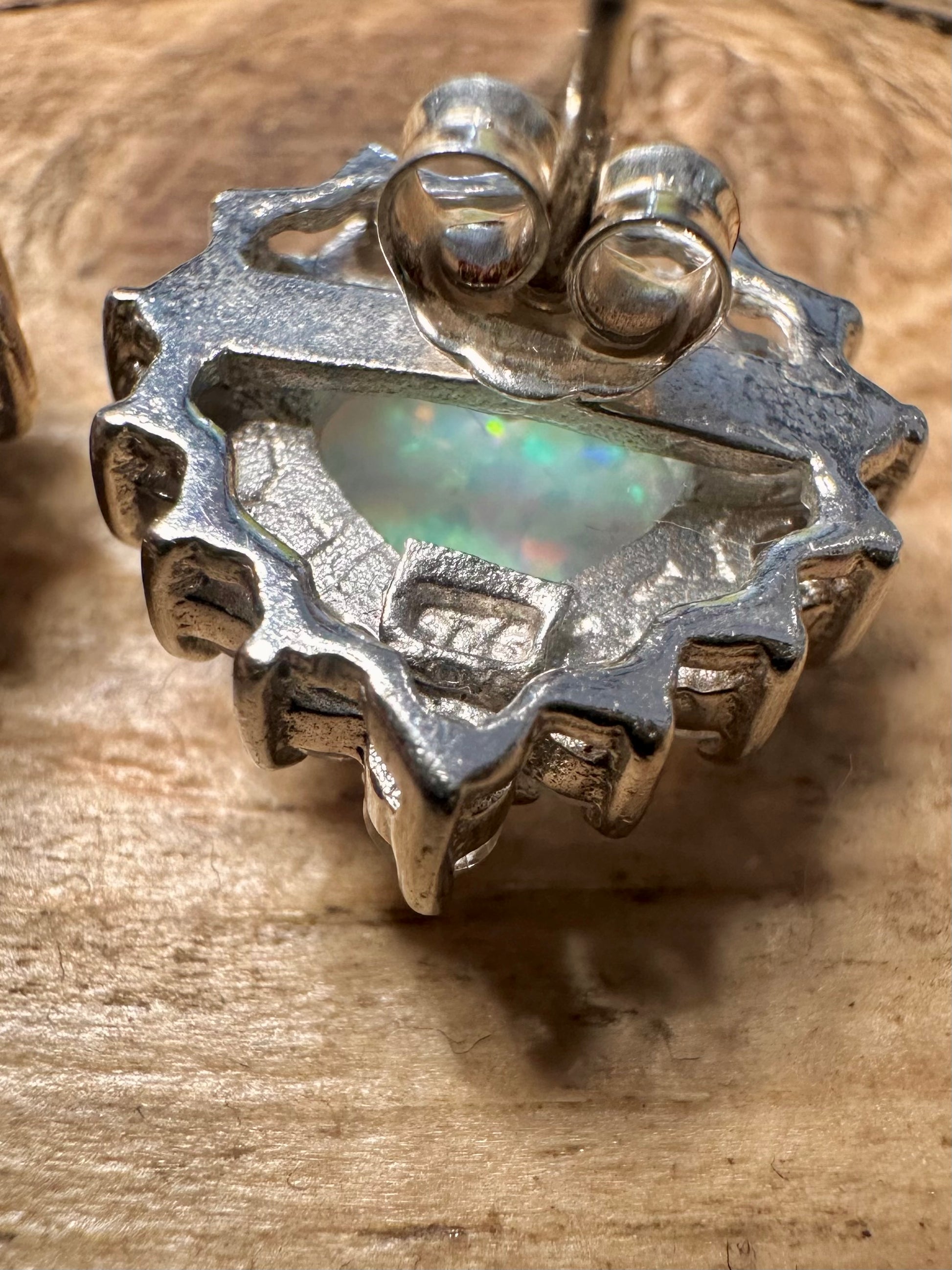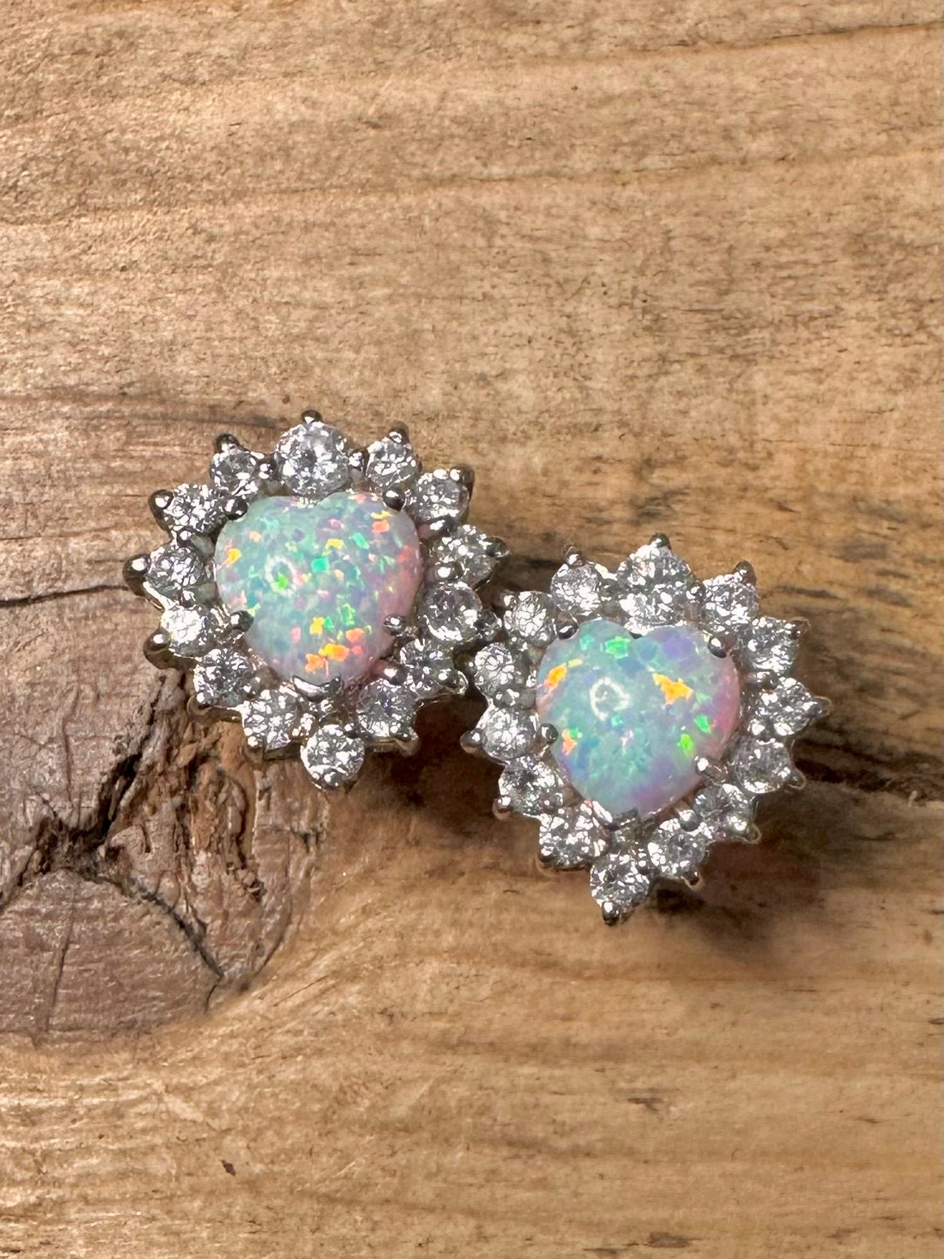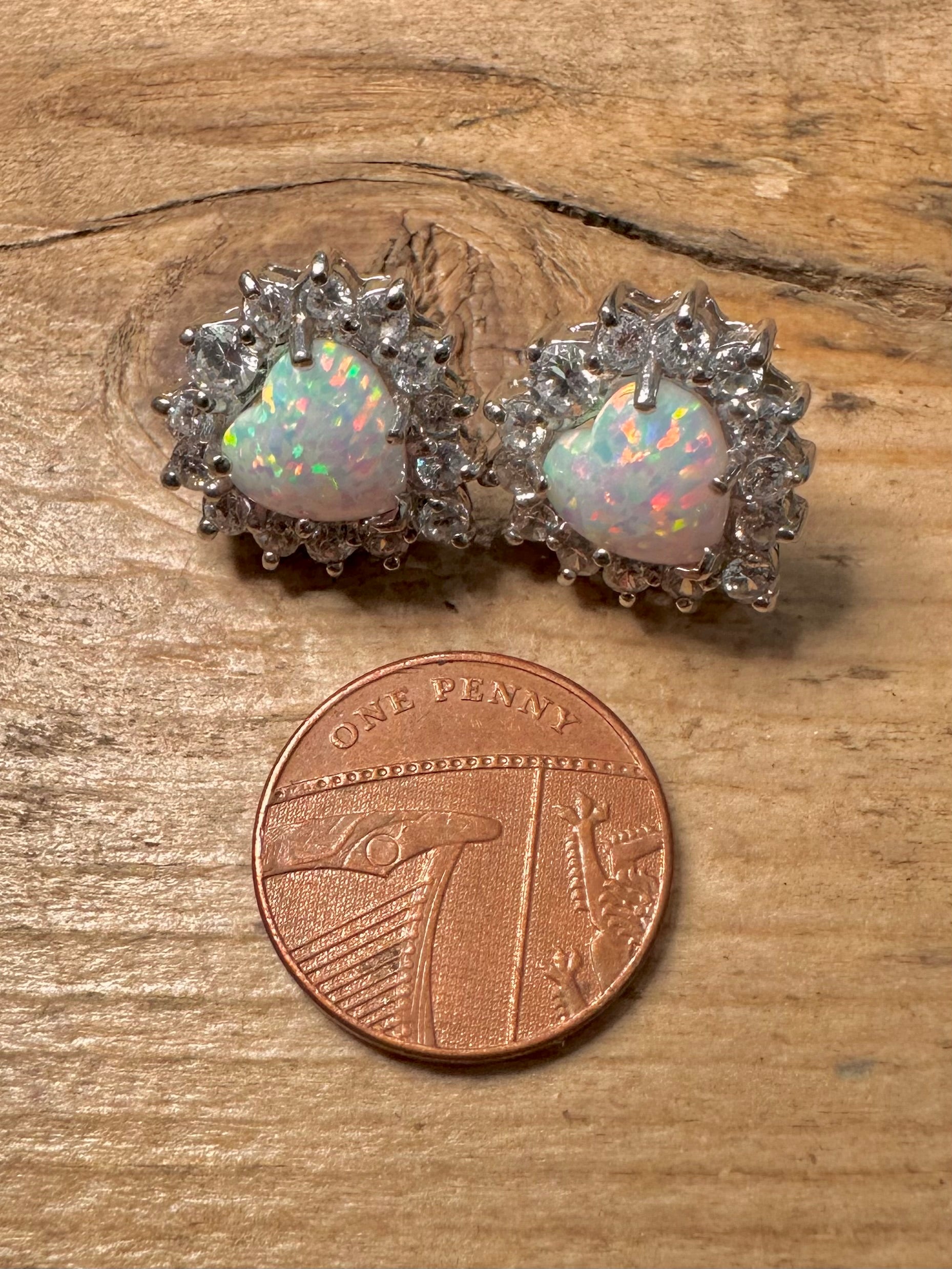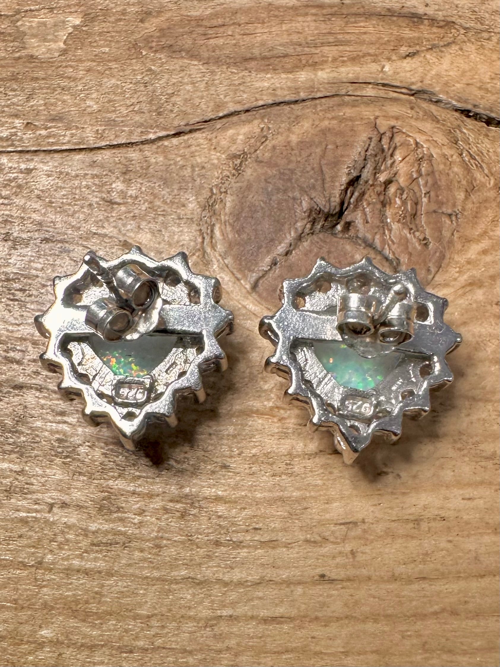 Modernist Opal and CZ Heart Shaped 925 Silver Stud Earrings