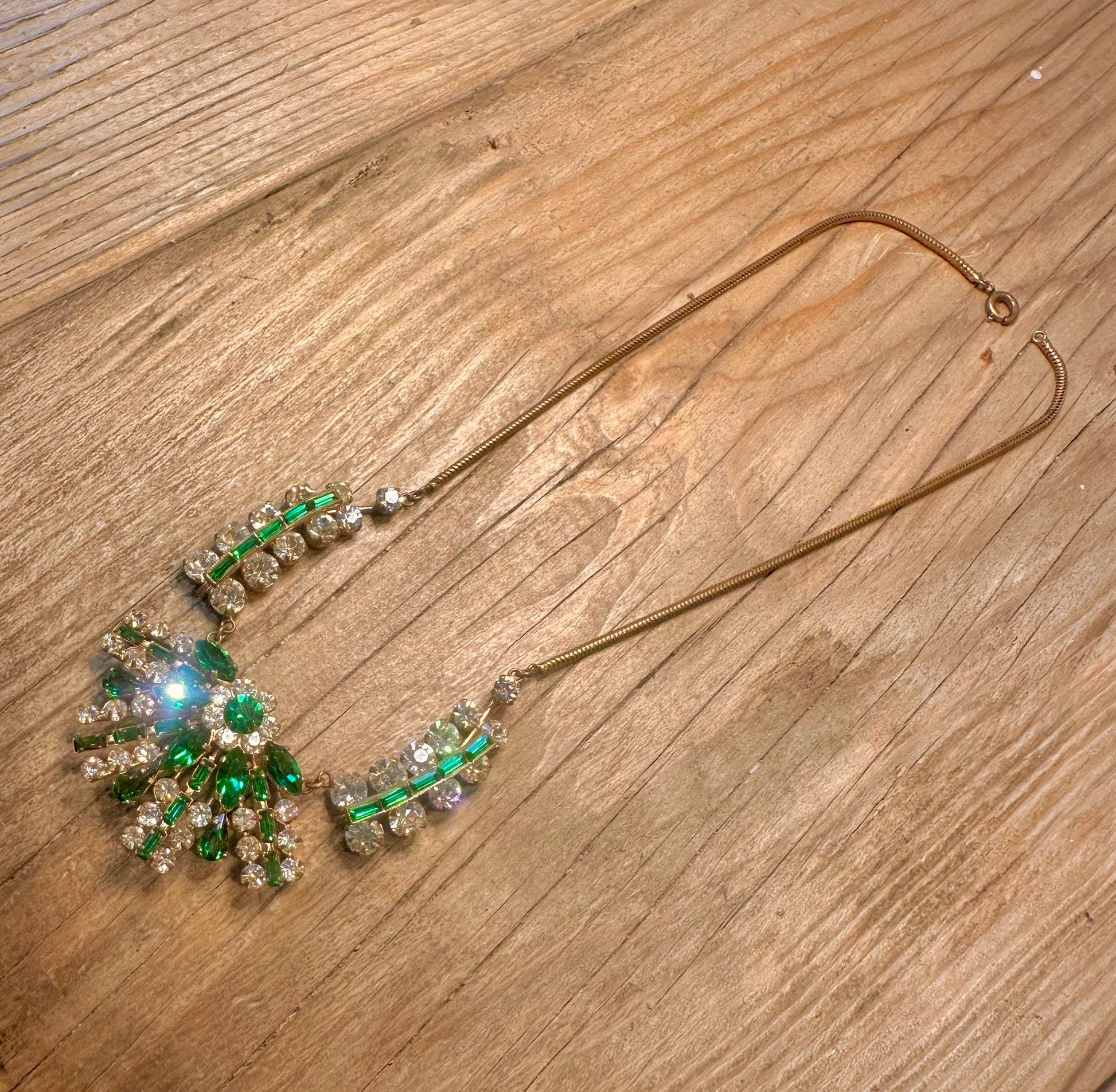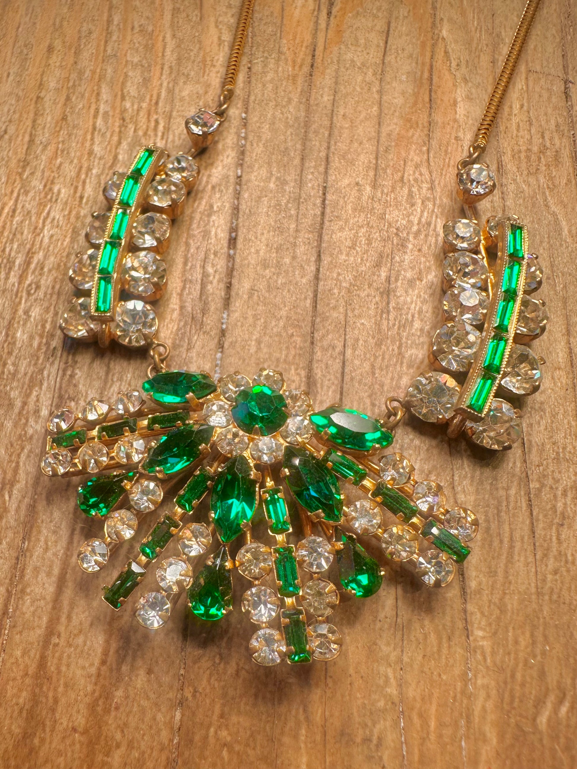 Vintage Art Deco Green and Clear Rhinestone Gold Tone 16 inch Costume Necklace