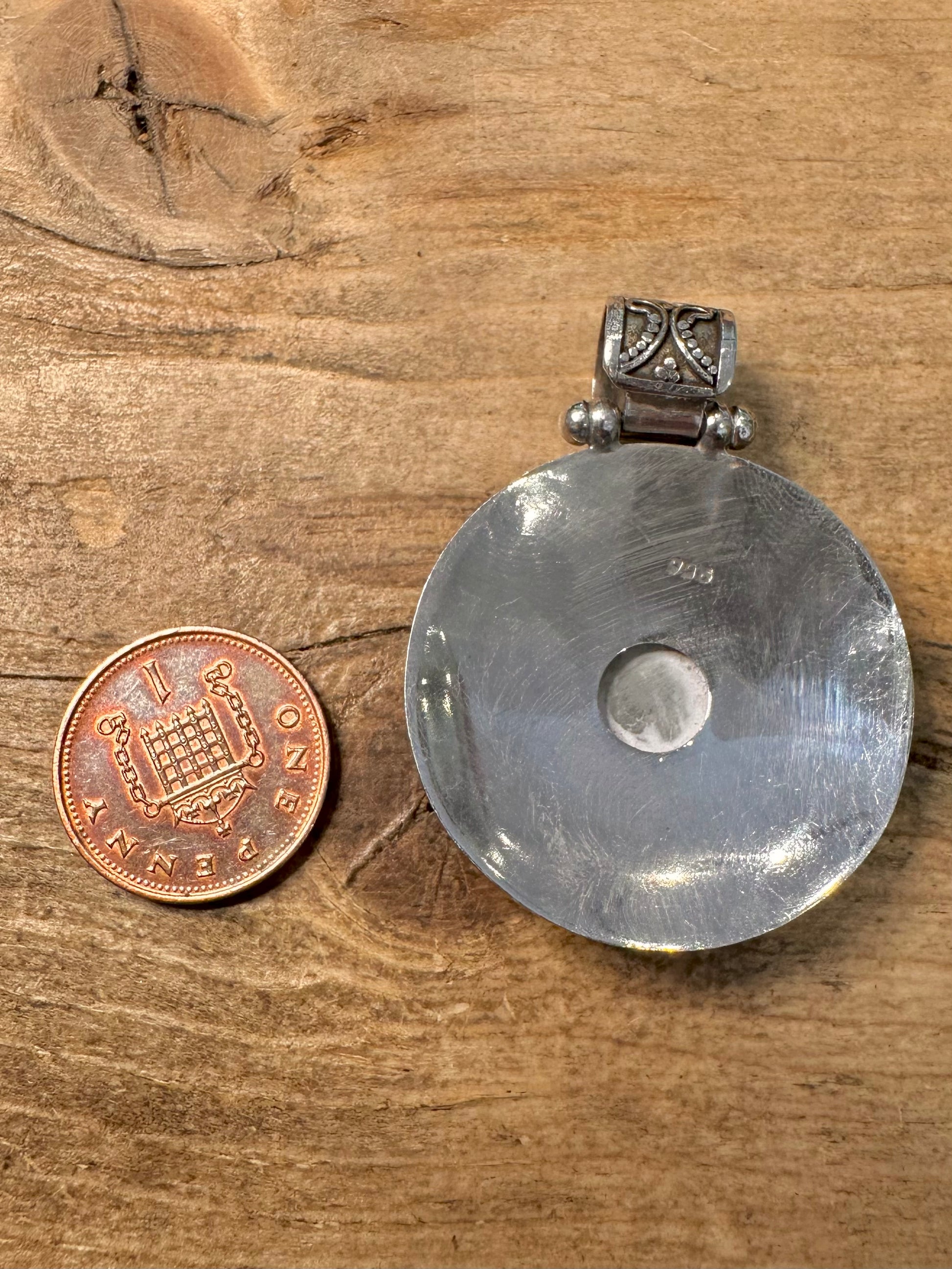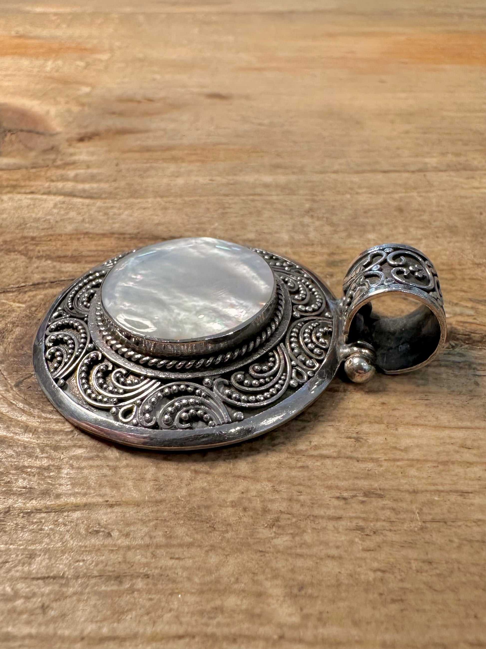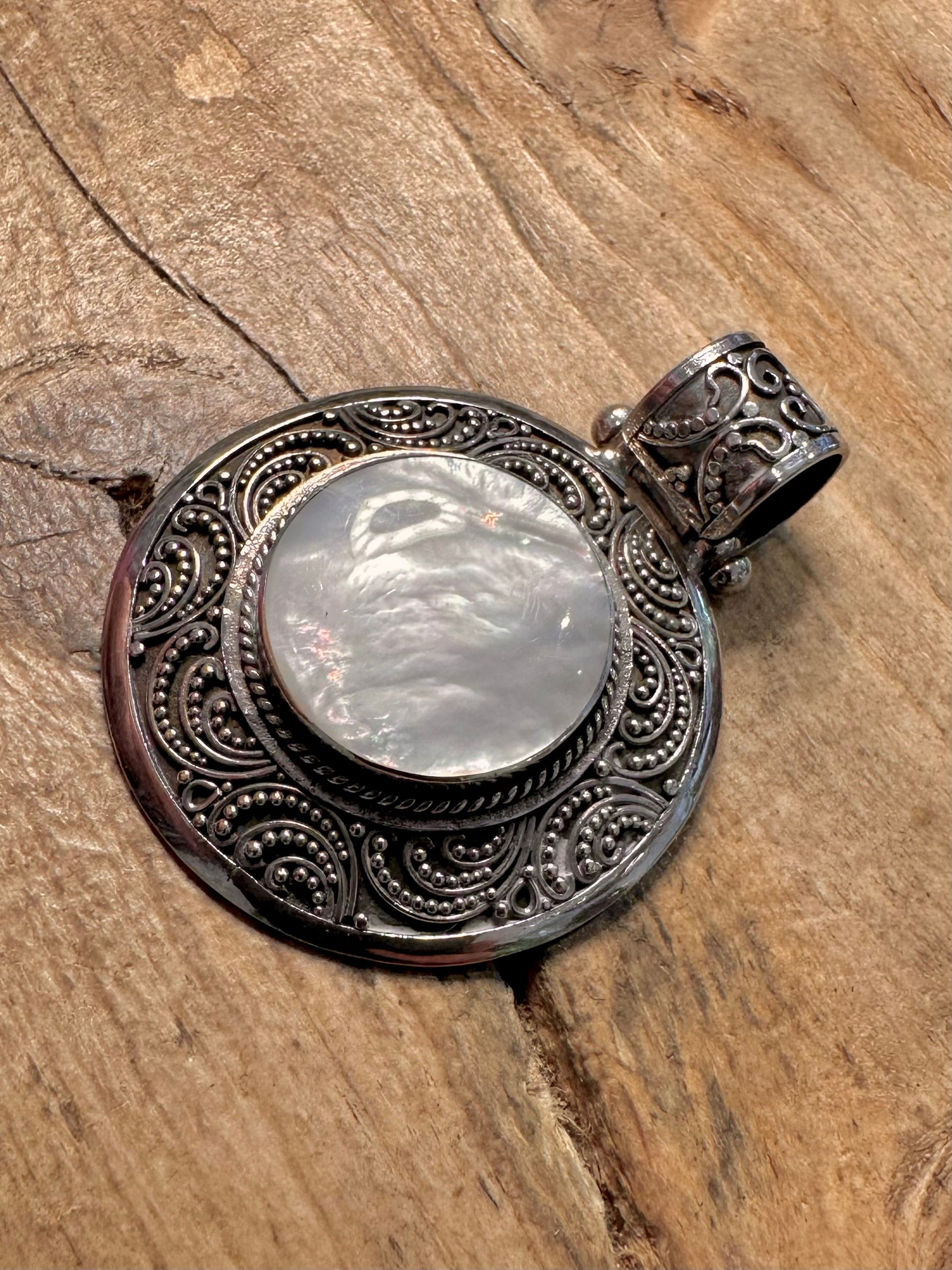 Vintage Boho Mother of Pearl Circle 925 Silver Pendant