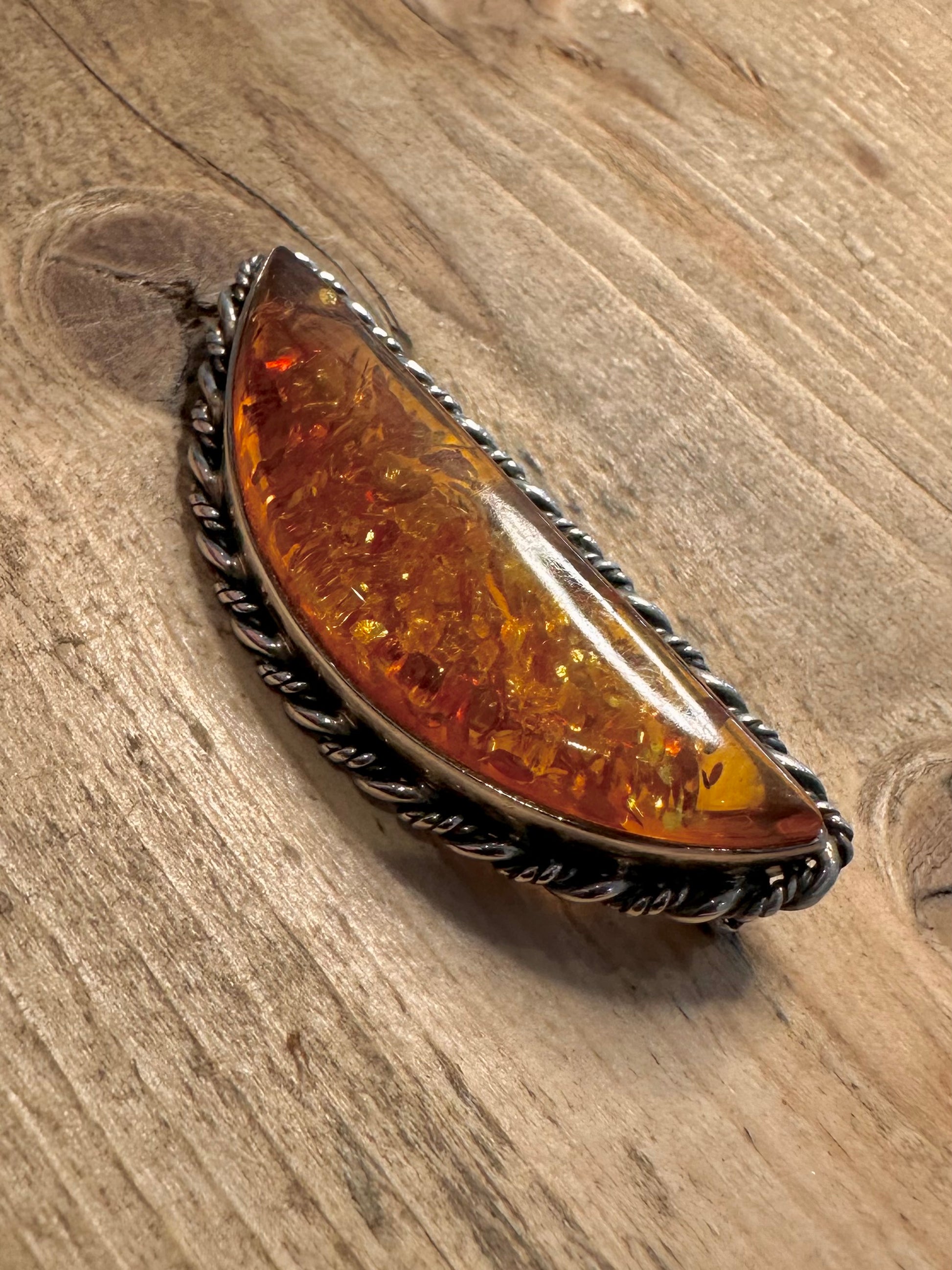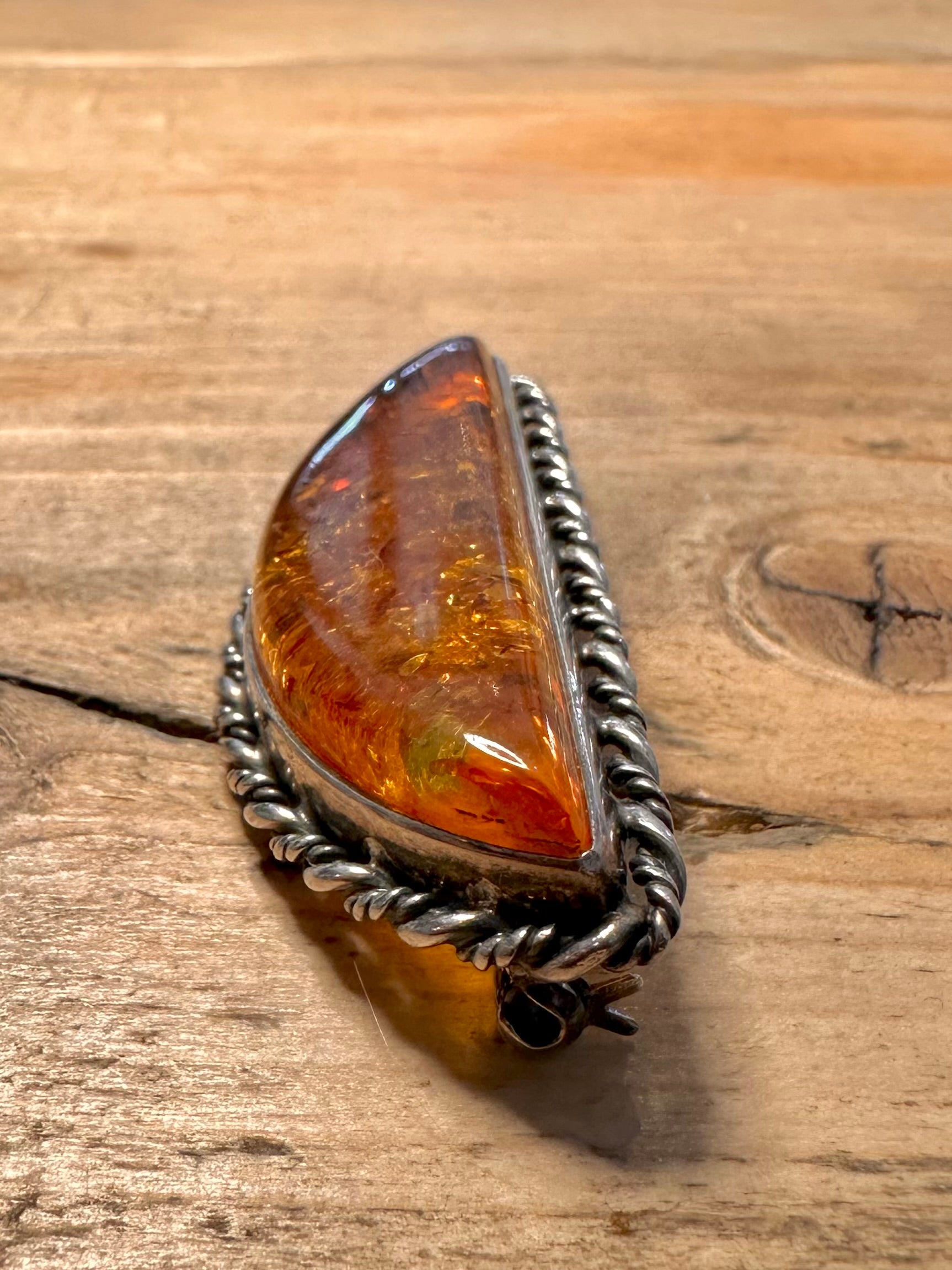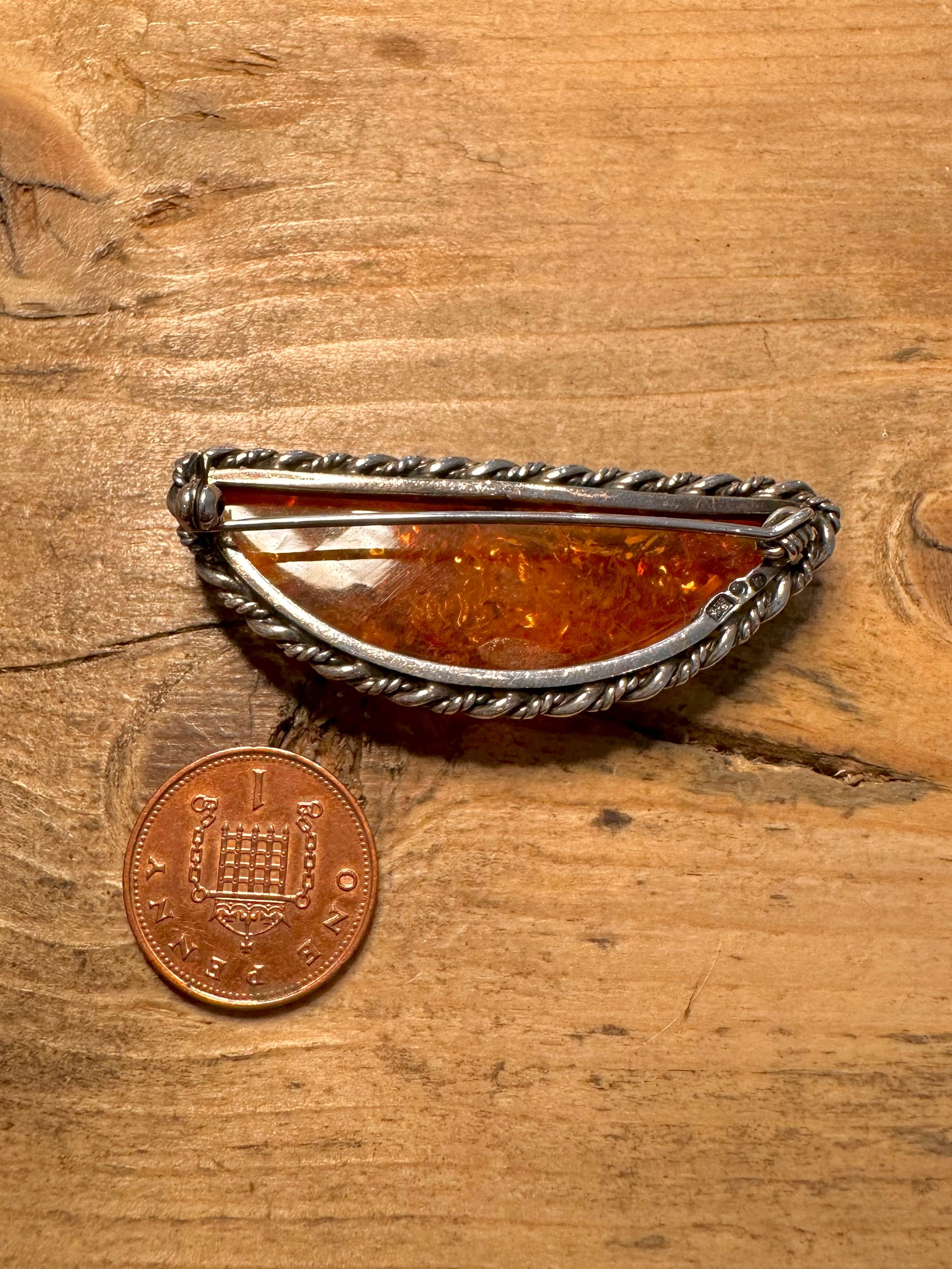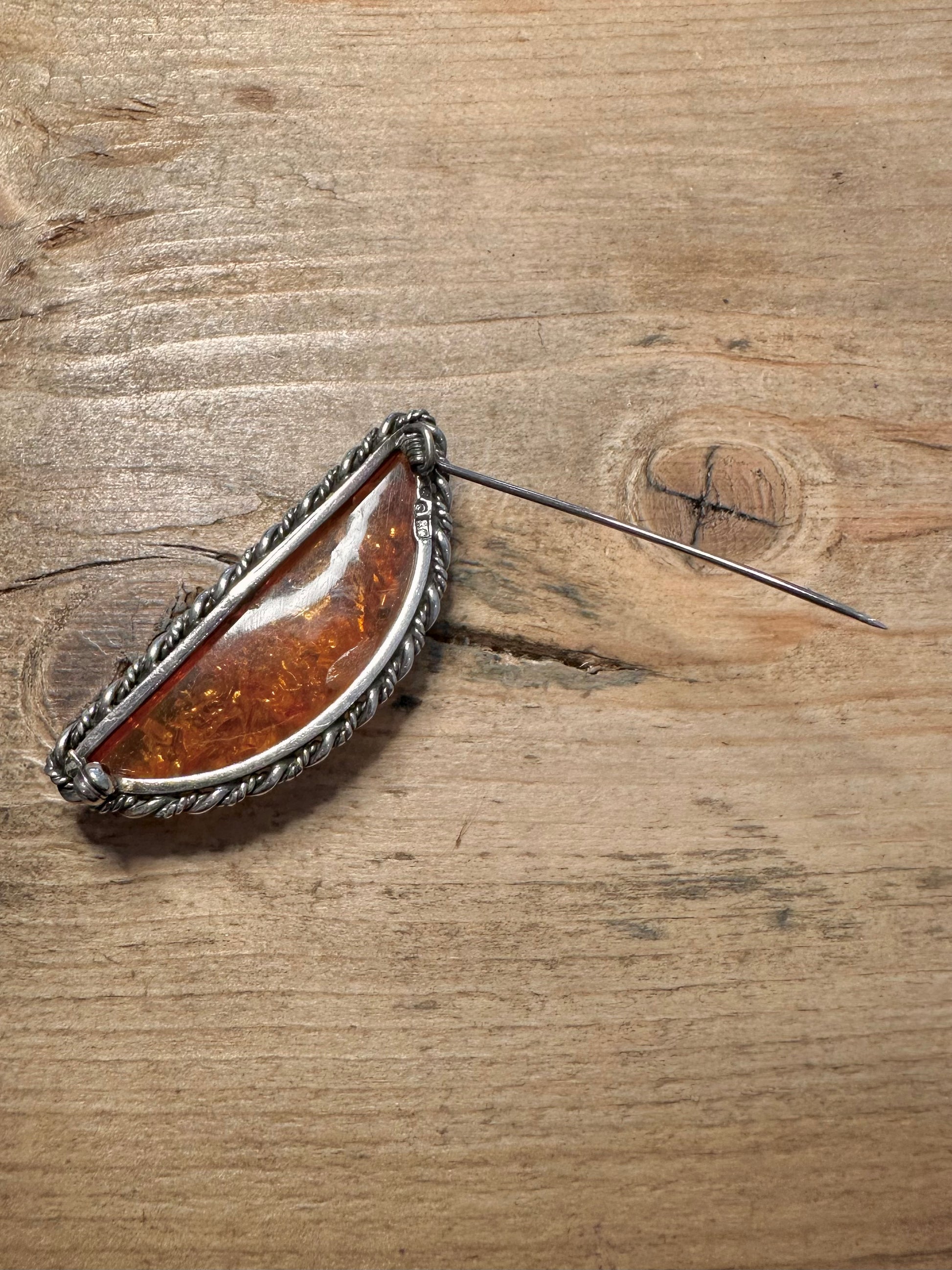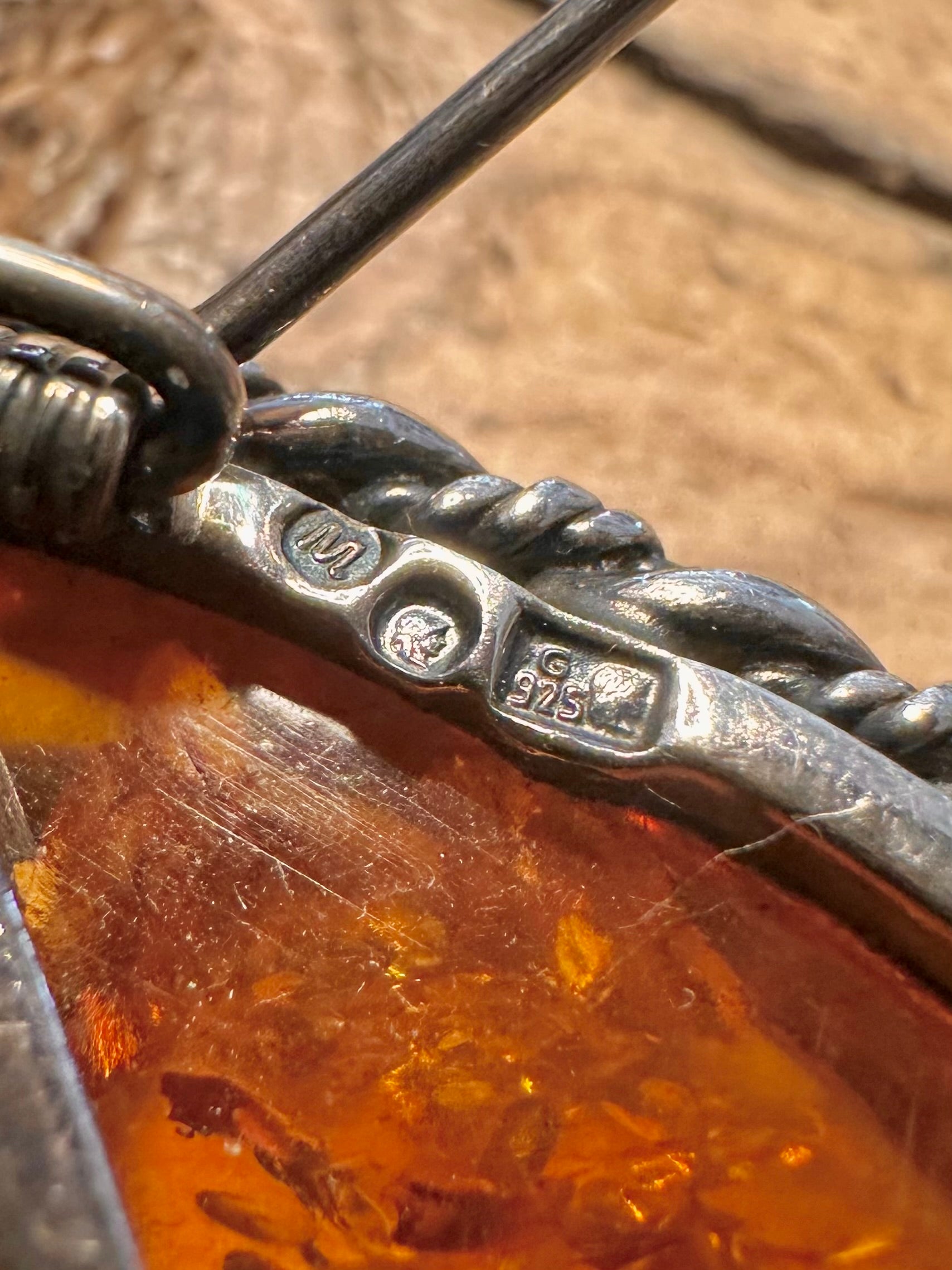 Vintage Embossed Amber 925 Silver Brooch