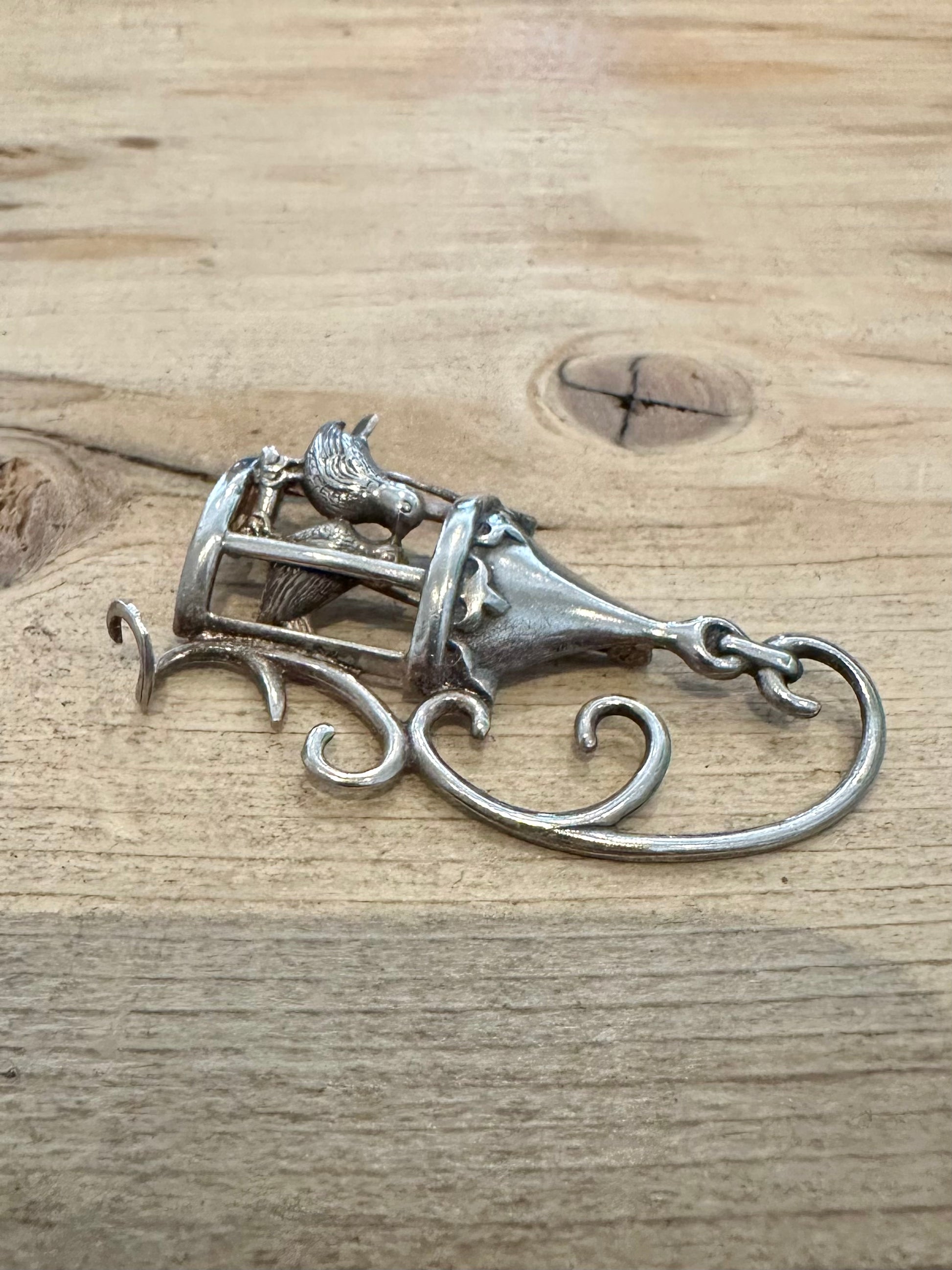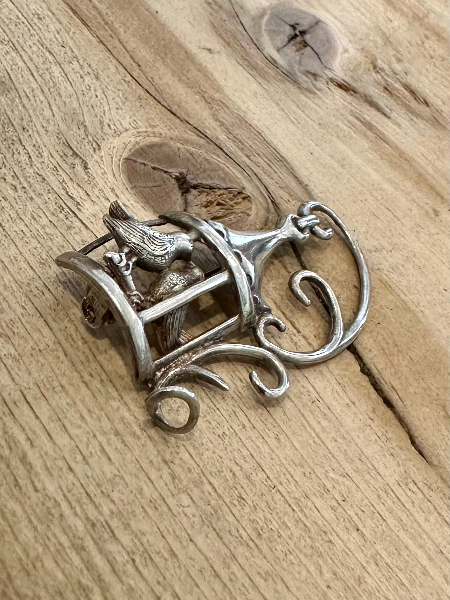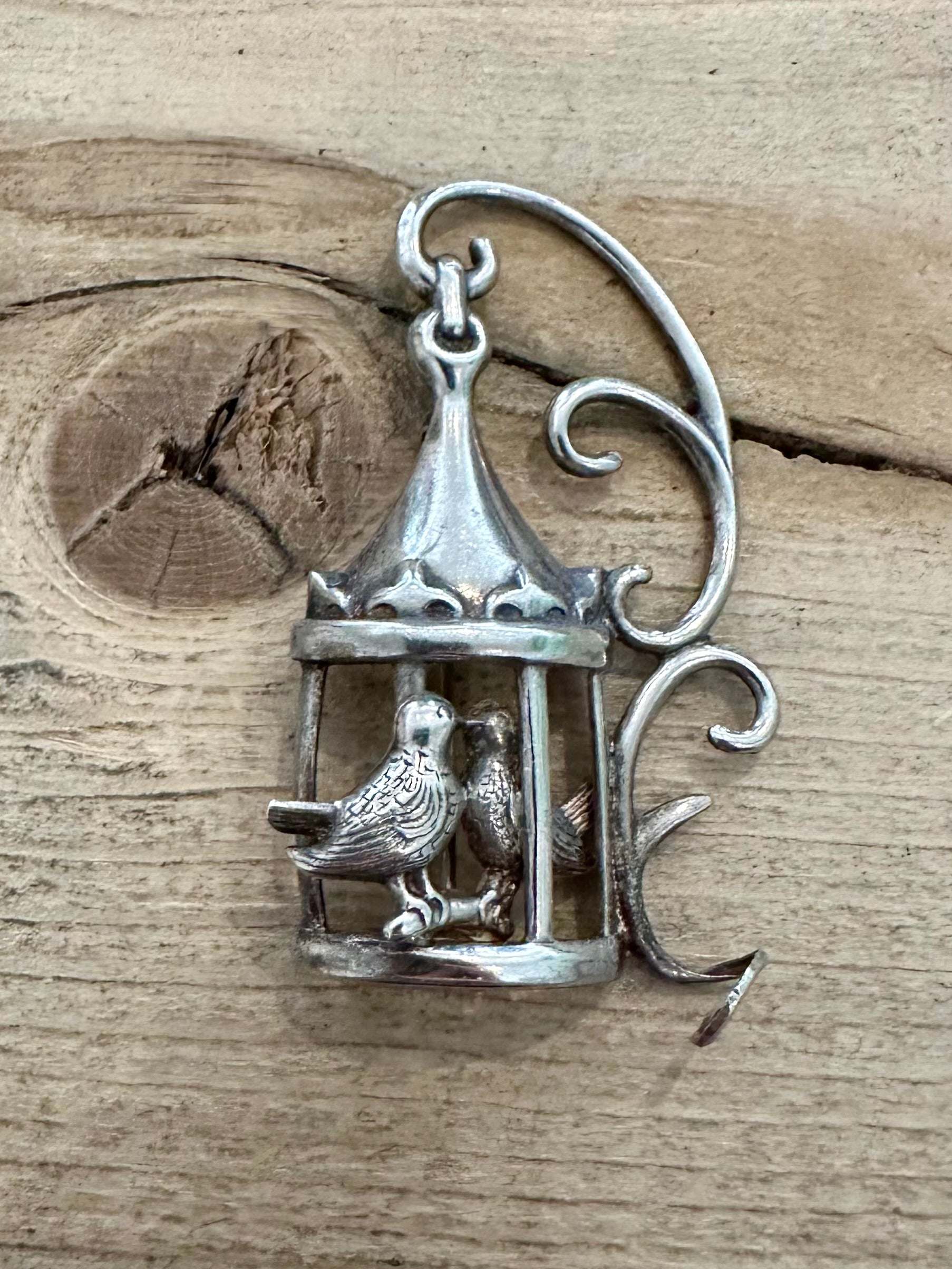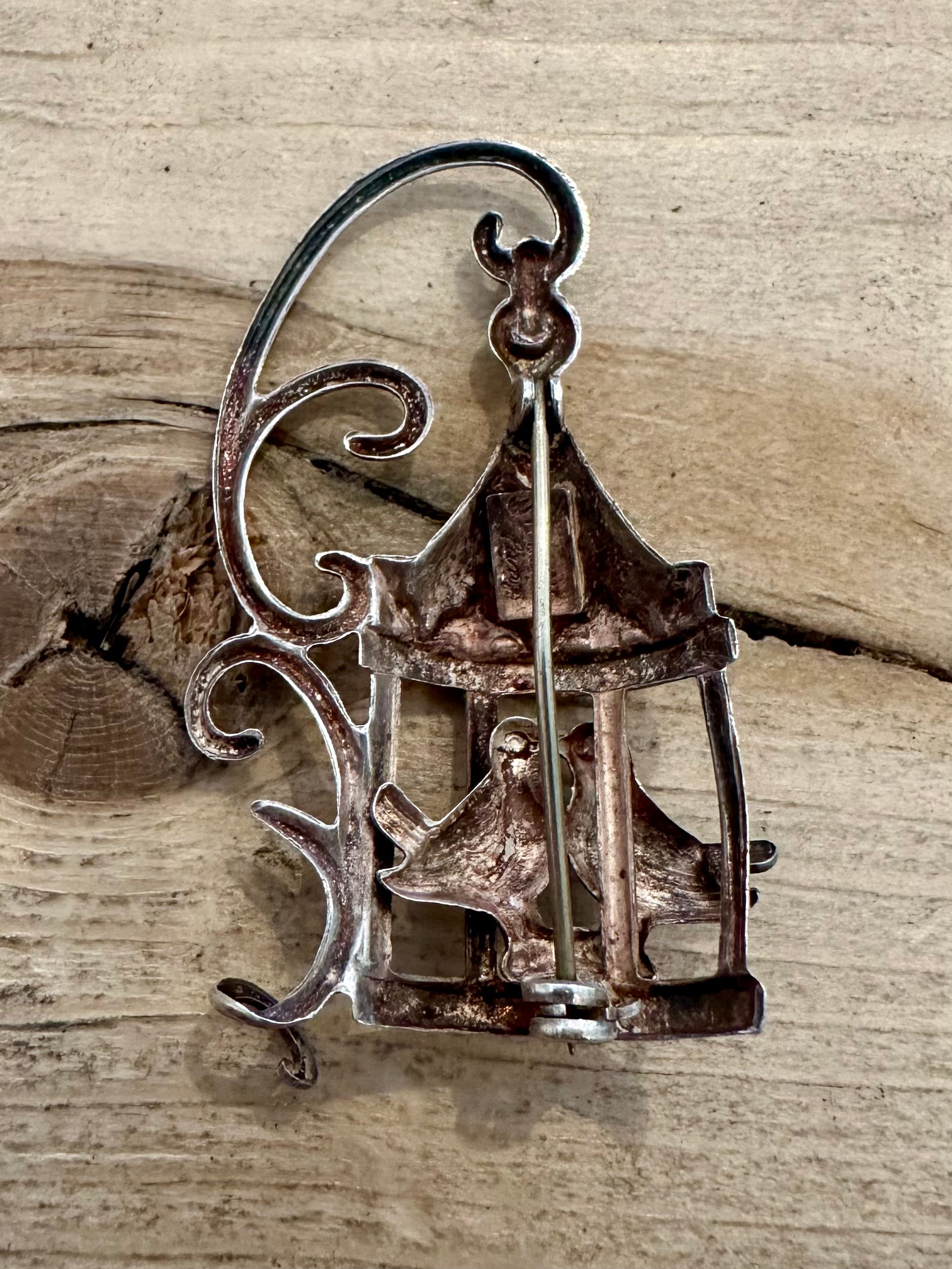 Vintage Lang Lovebirds in Victorian Bird Cage 925 Silver Brooch