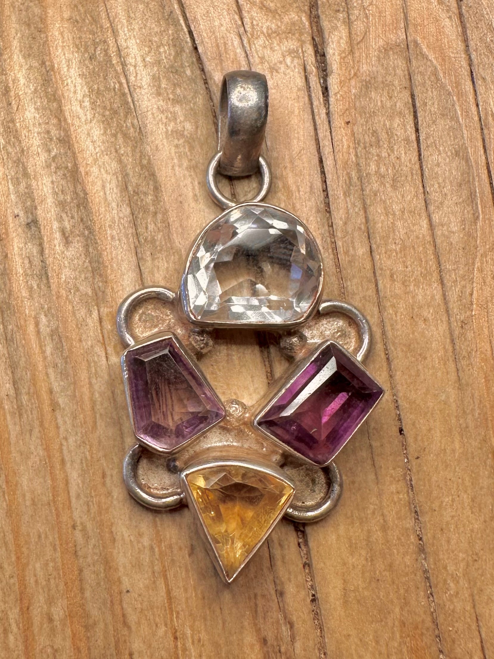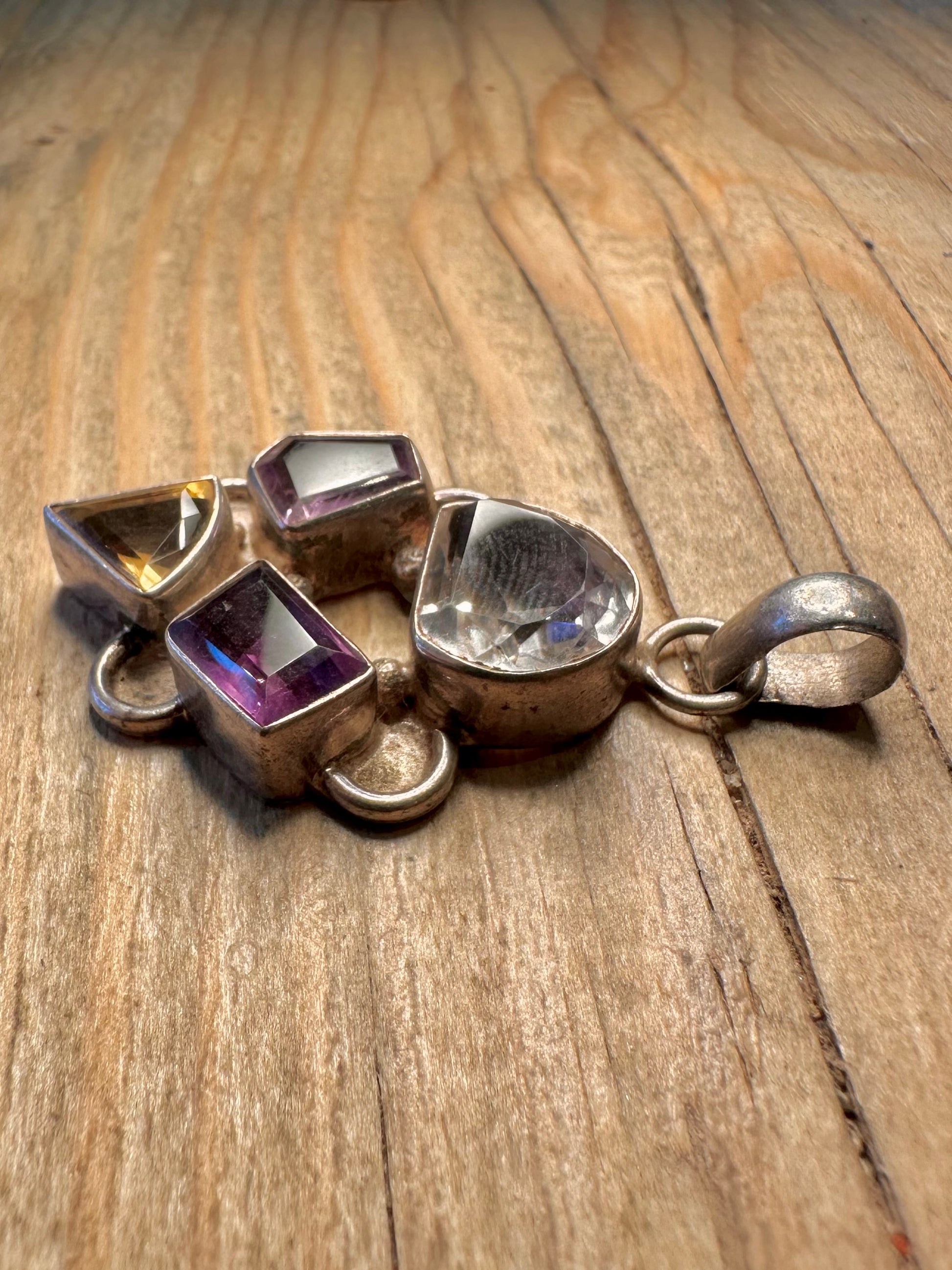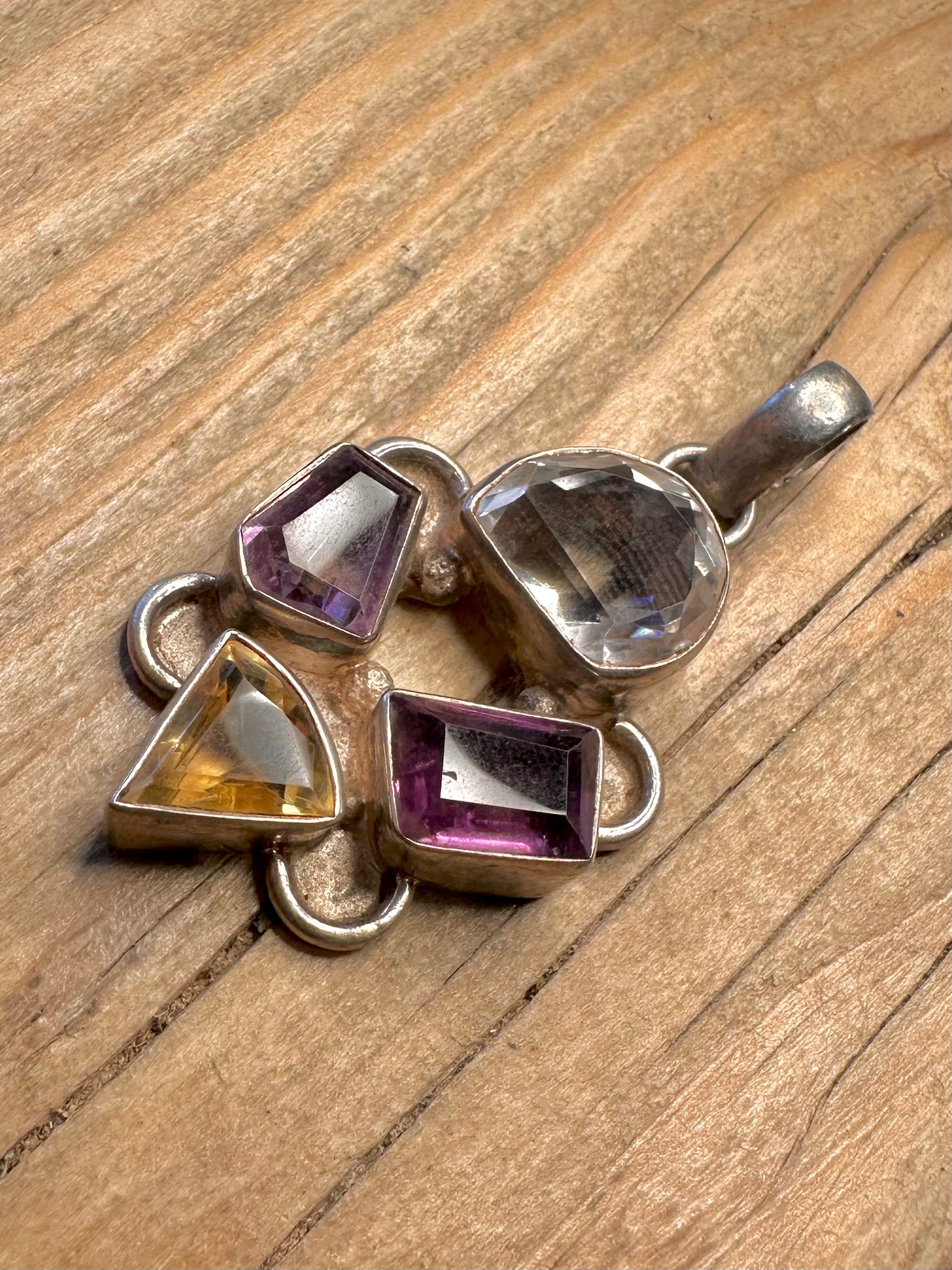 Vintage Multi Gemstone Citrine Amethyst Quarts 925 Sterling Silver Pendant