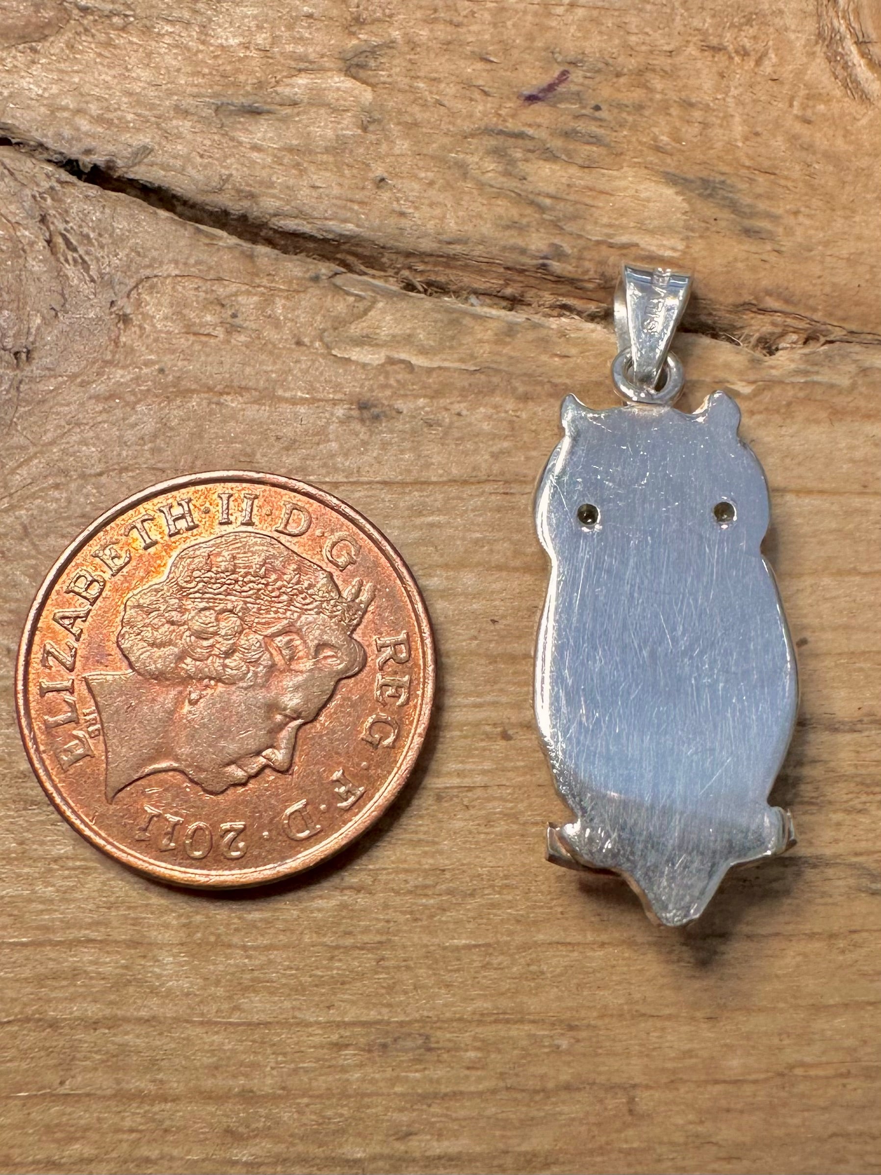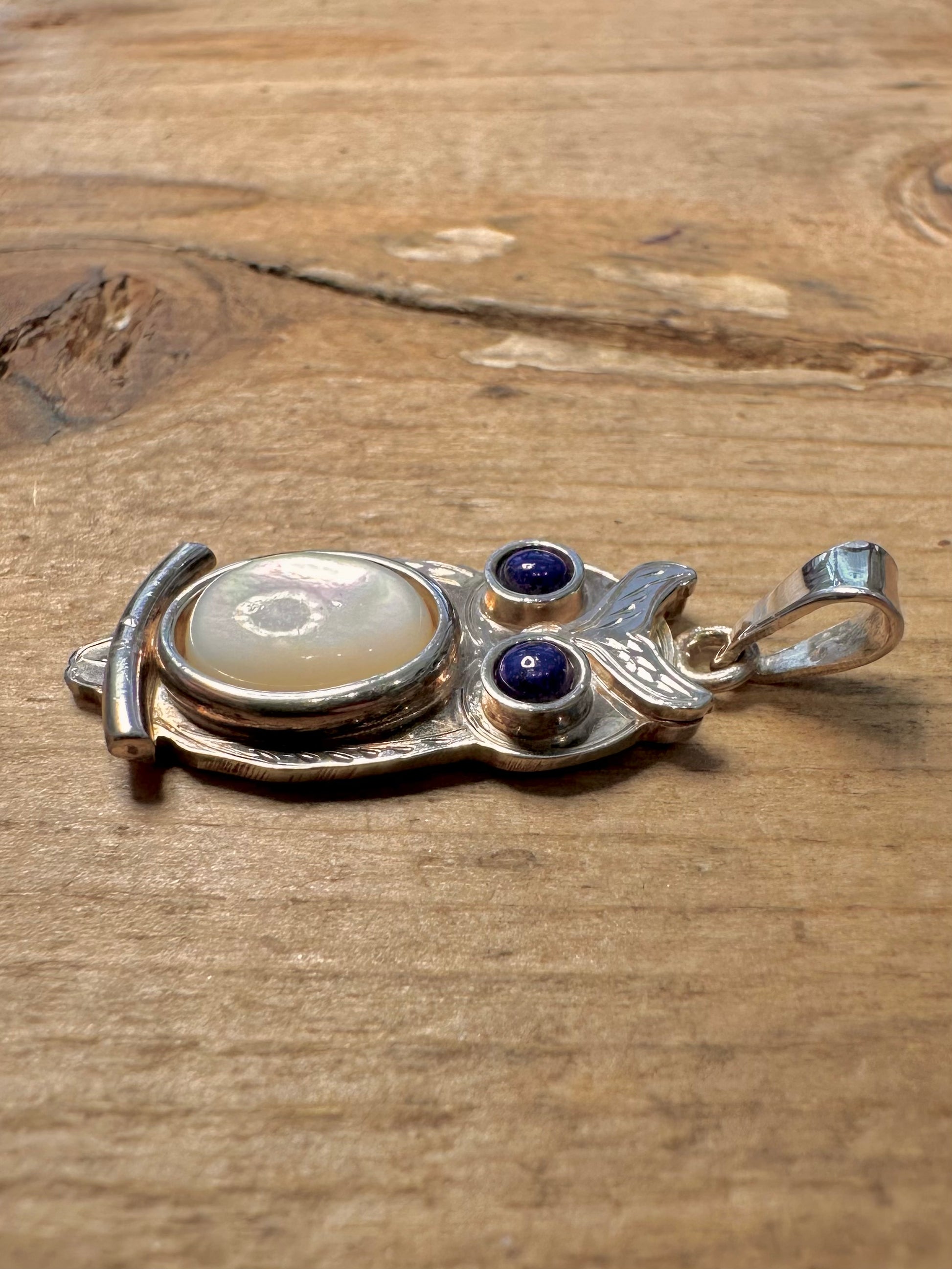 Vintage Owl Mother of Pearl and Lapis 925 Silver Pendant