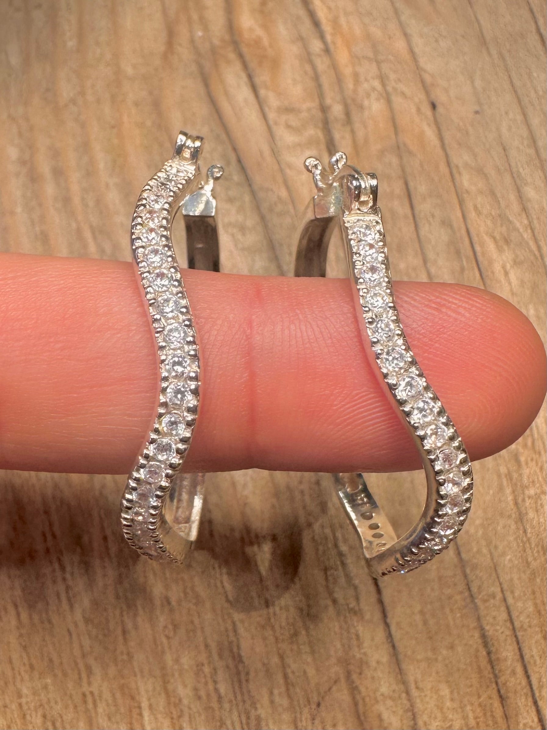 Modern Wavy CZ Stone 925 Sterling Silver Hoop Earrings
