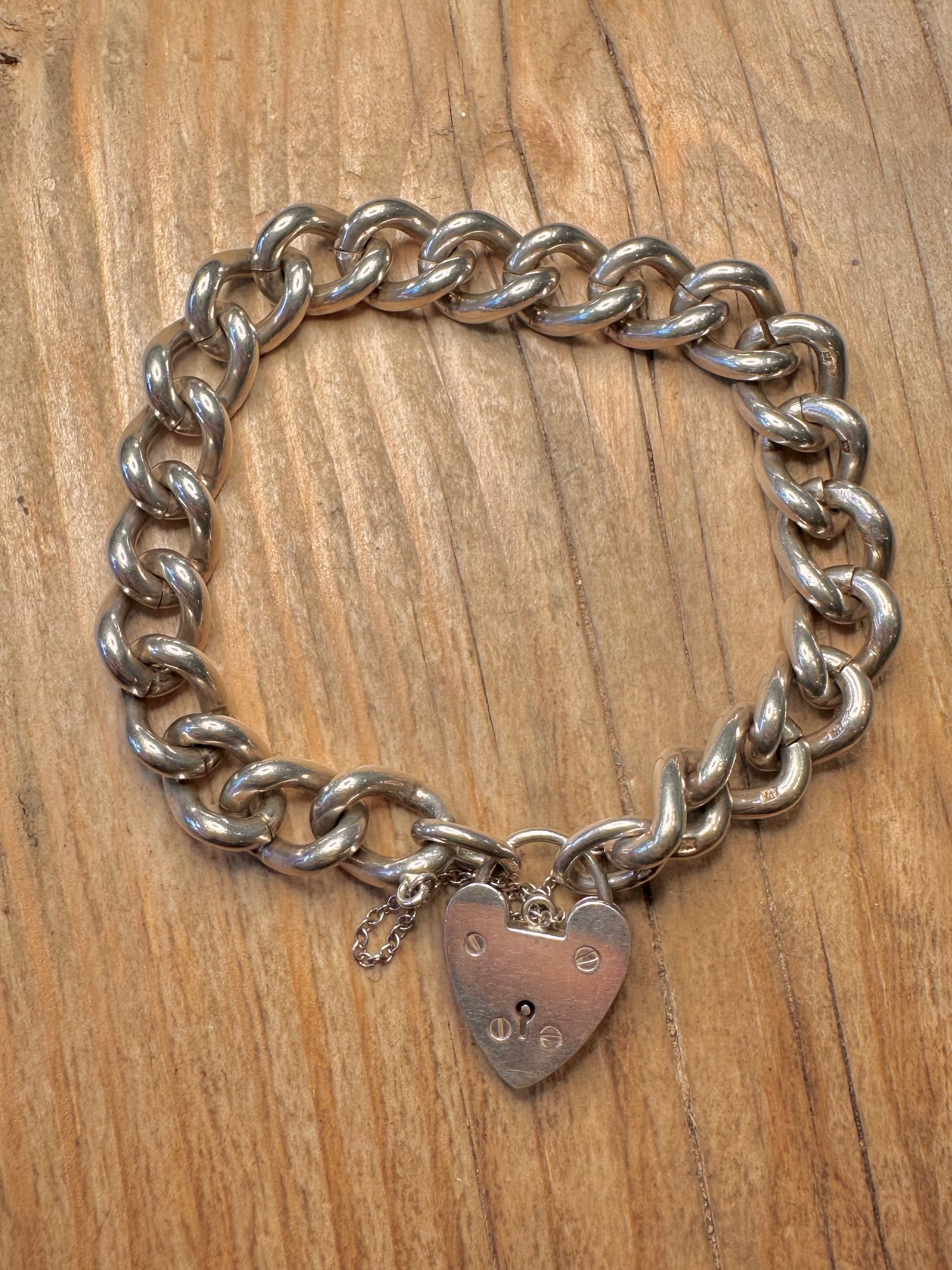 Vintage 1967 Chunky Curb Chain Heart Padlock 925 Sterling Silver Hallmarked 7.5 inch Bracelet