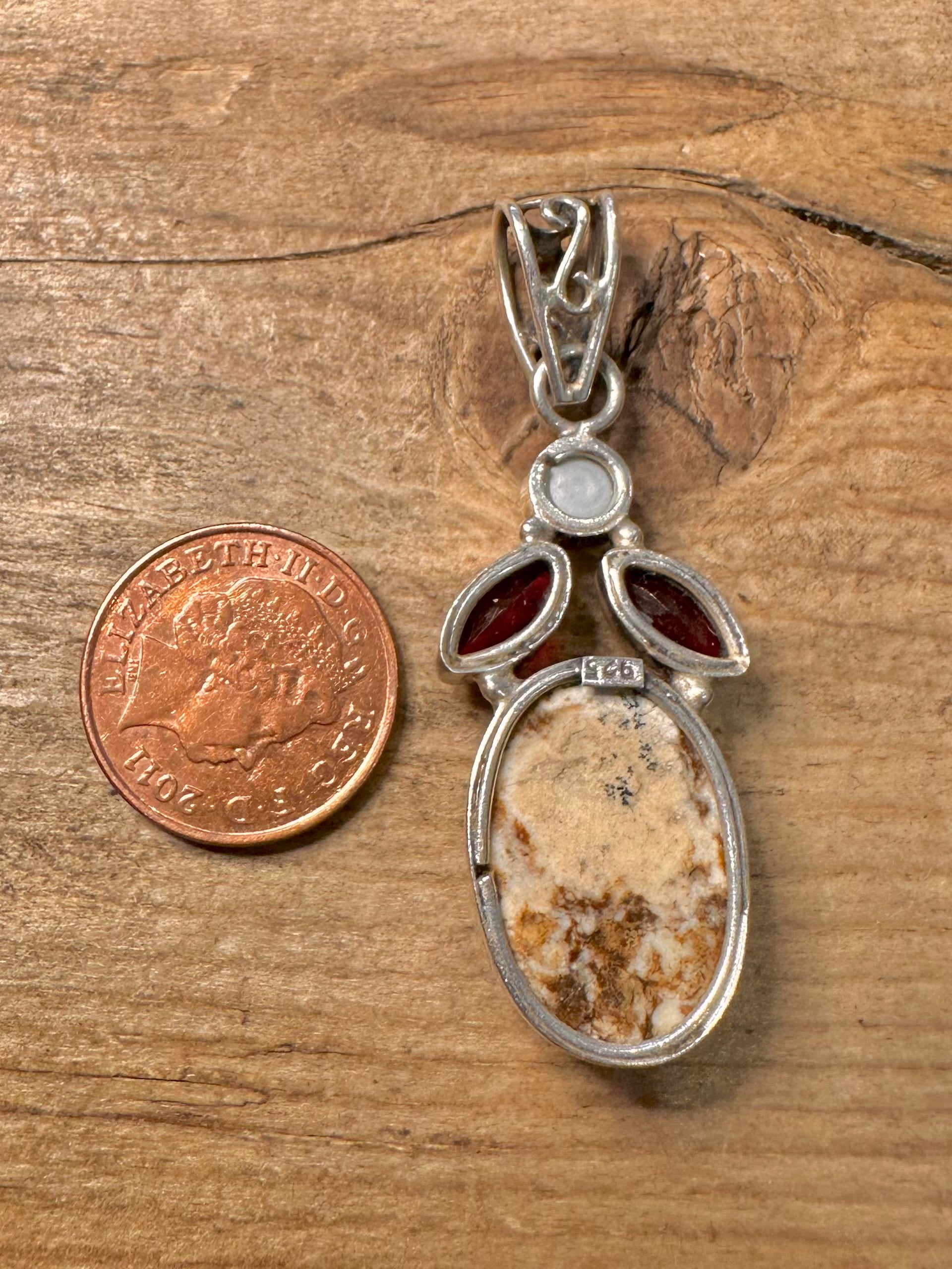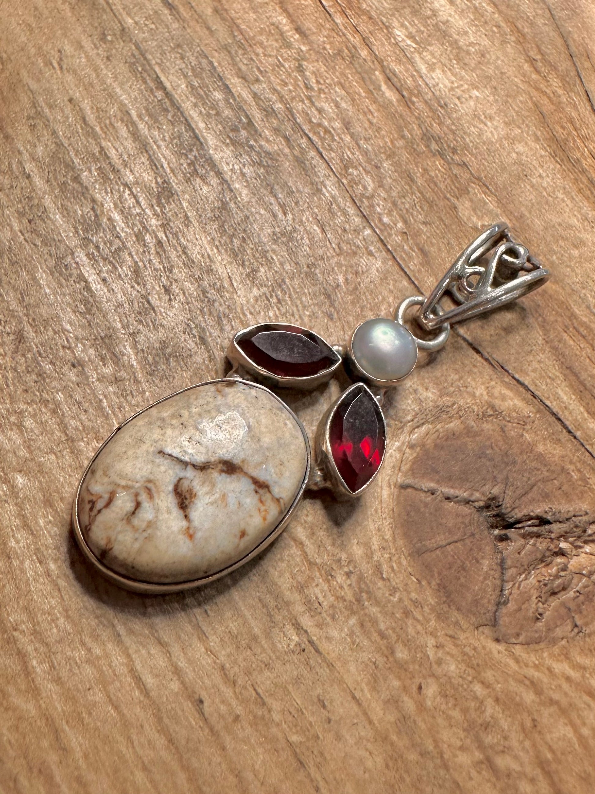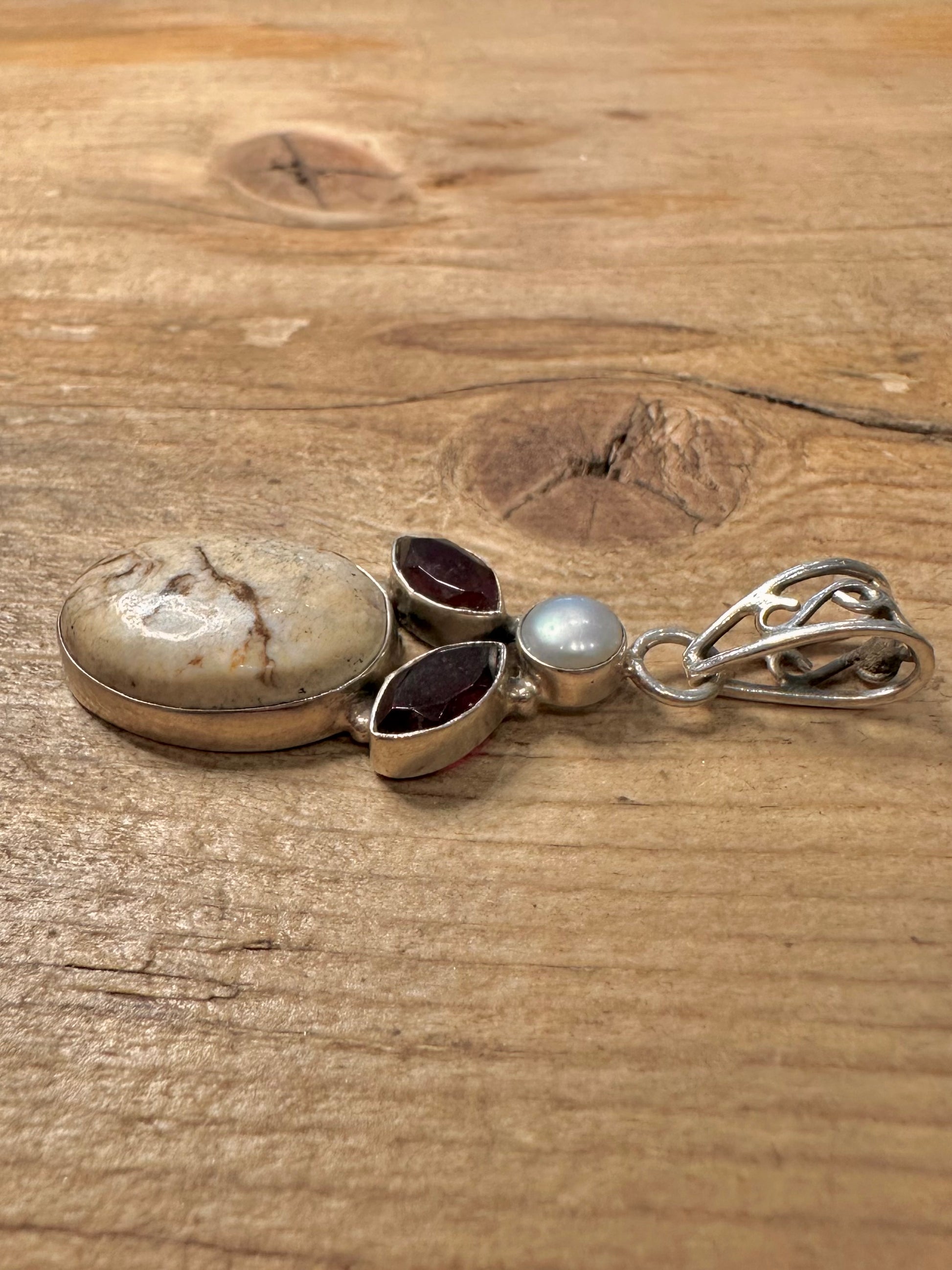 Vintage Agate Garnet and Pearl 925 Silver Pendant