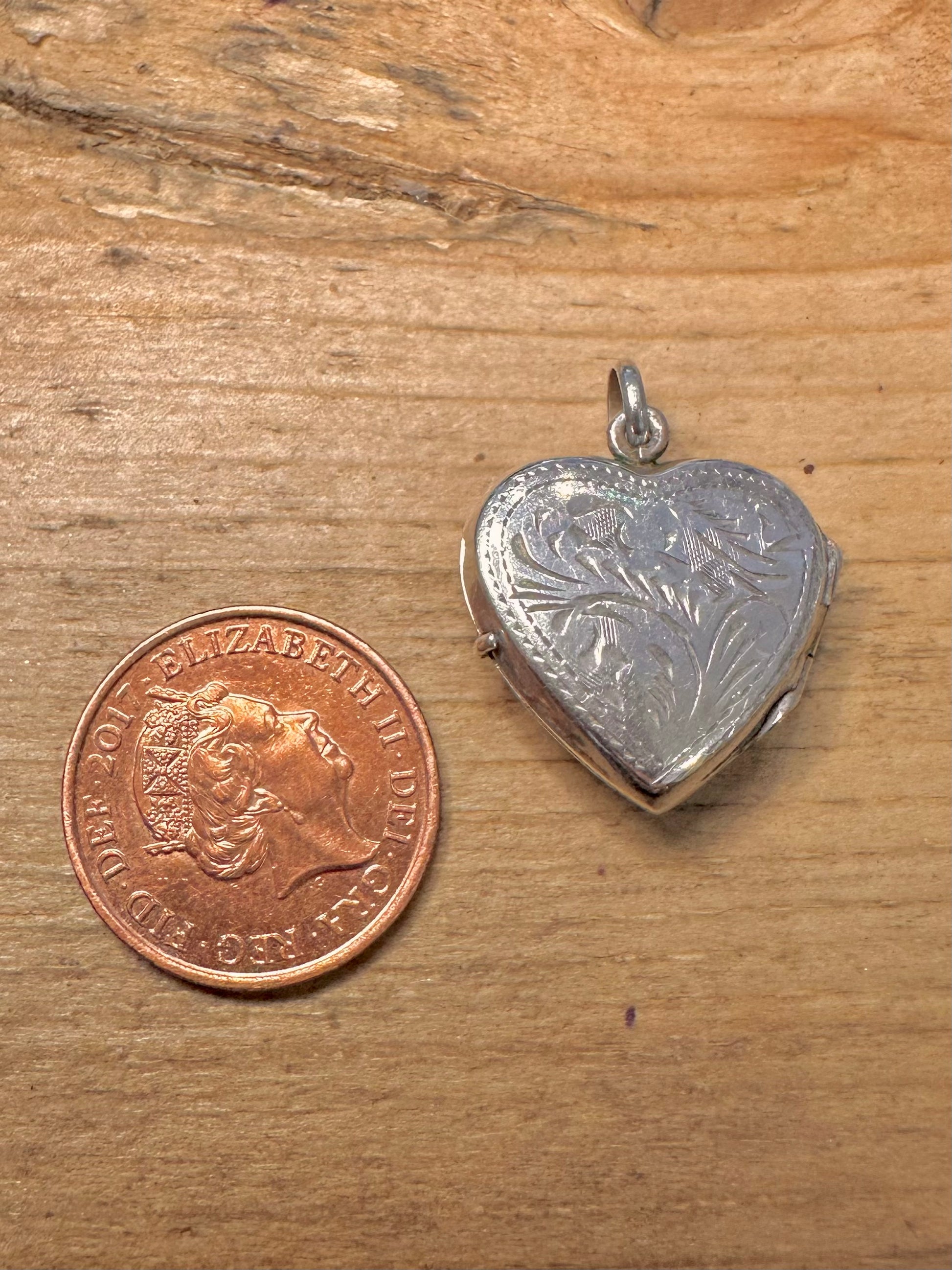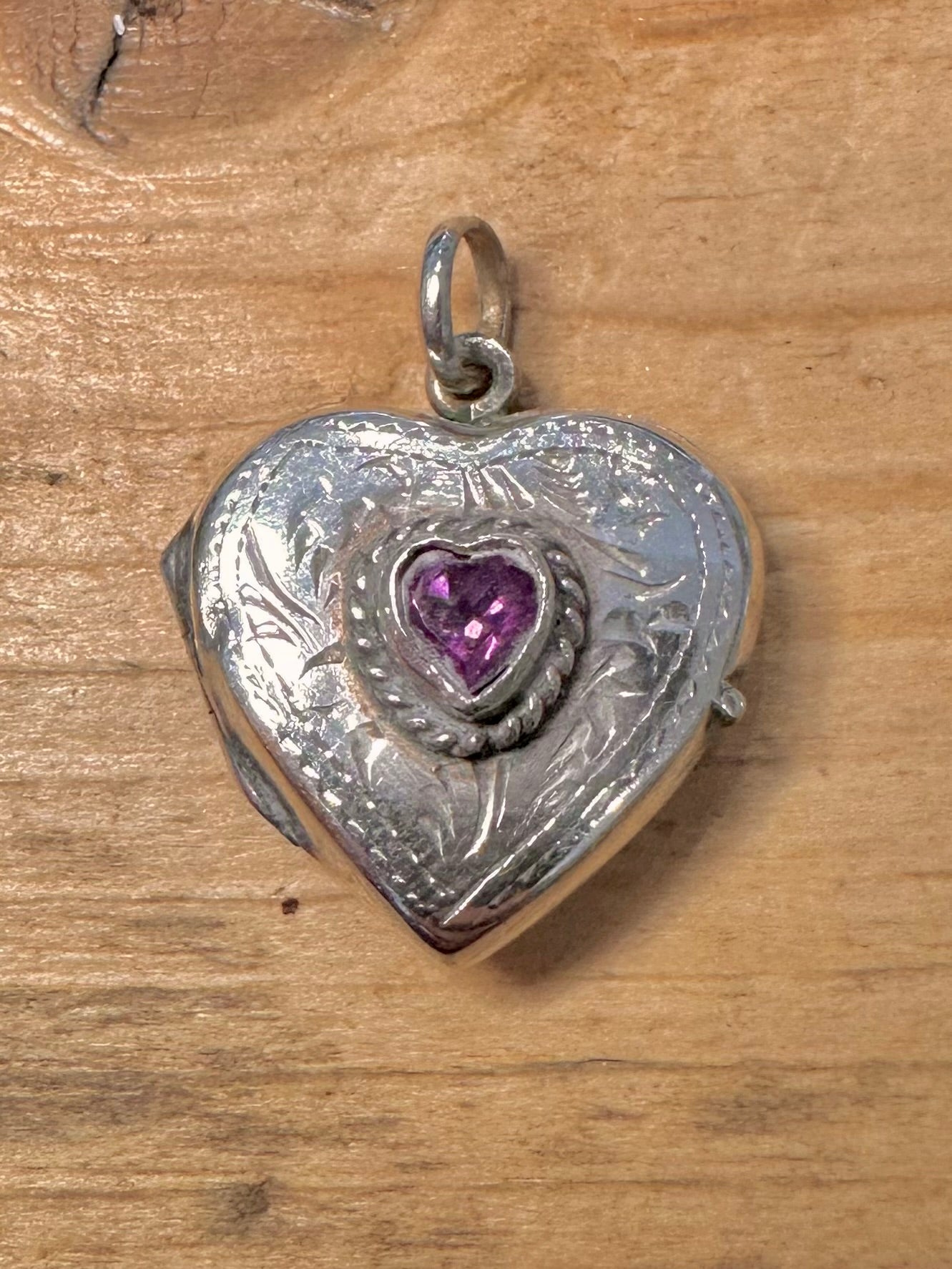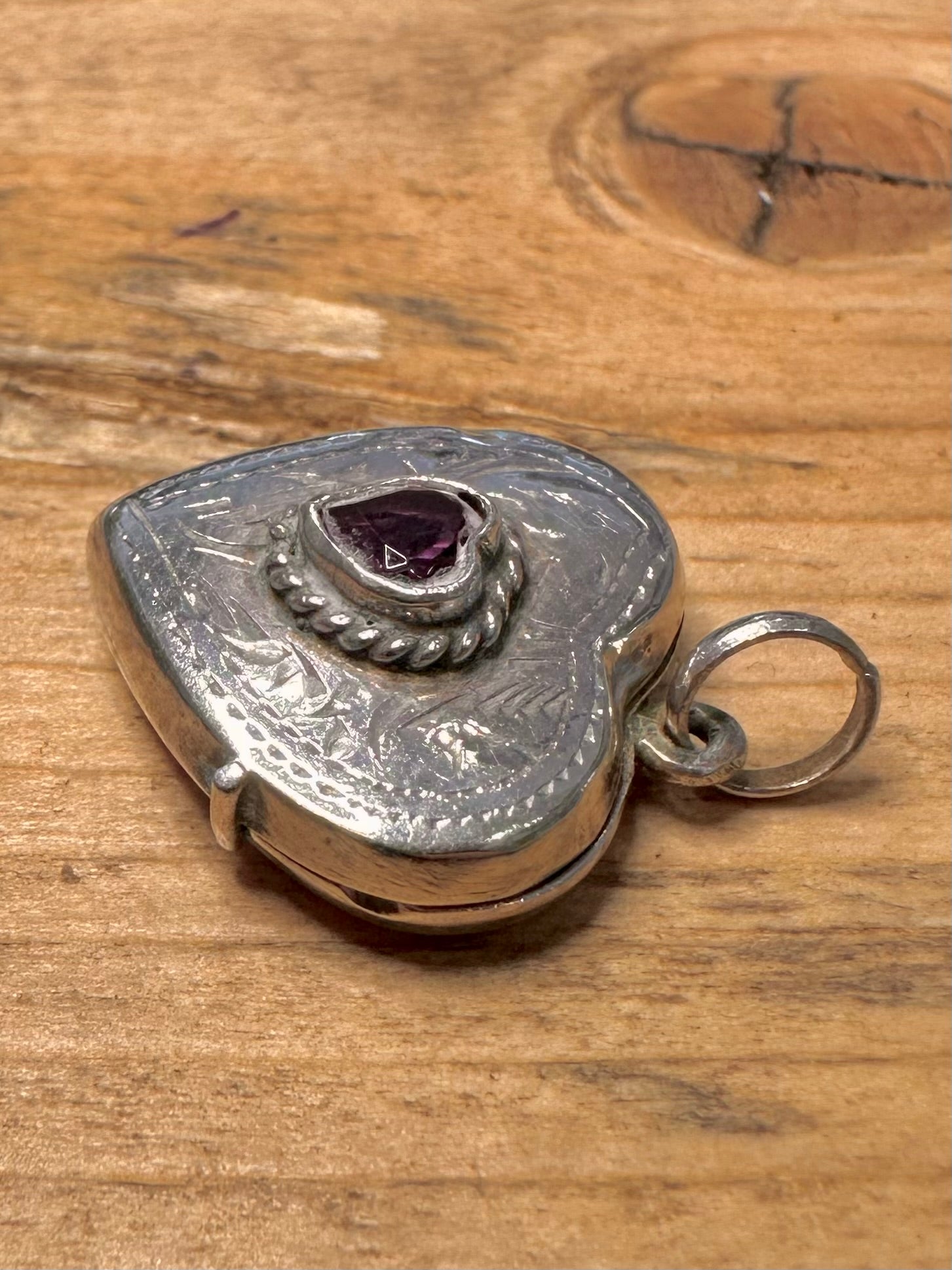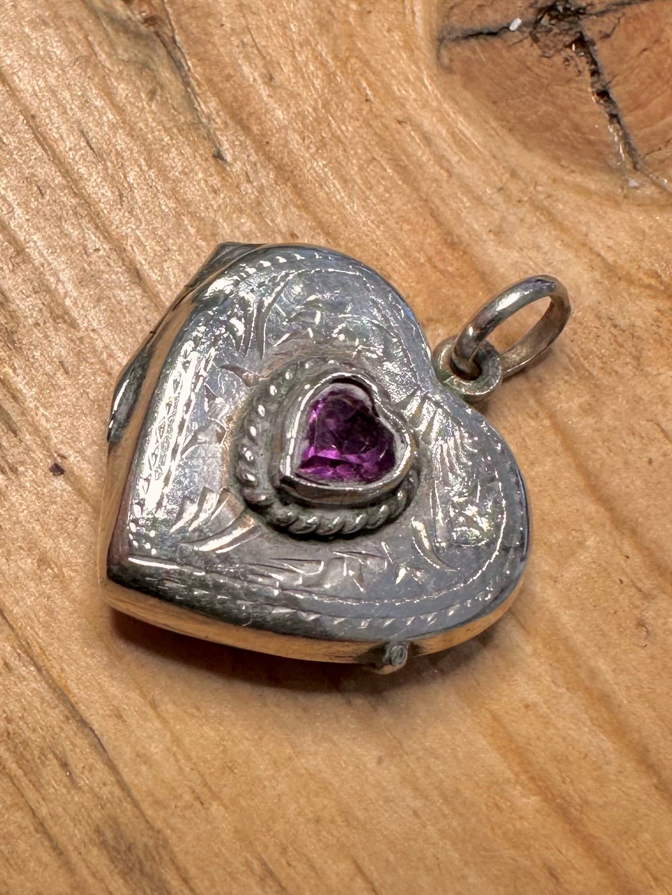 Vintage Amethyst Engraved Heart Locket 925 Silver Pendant