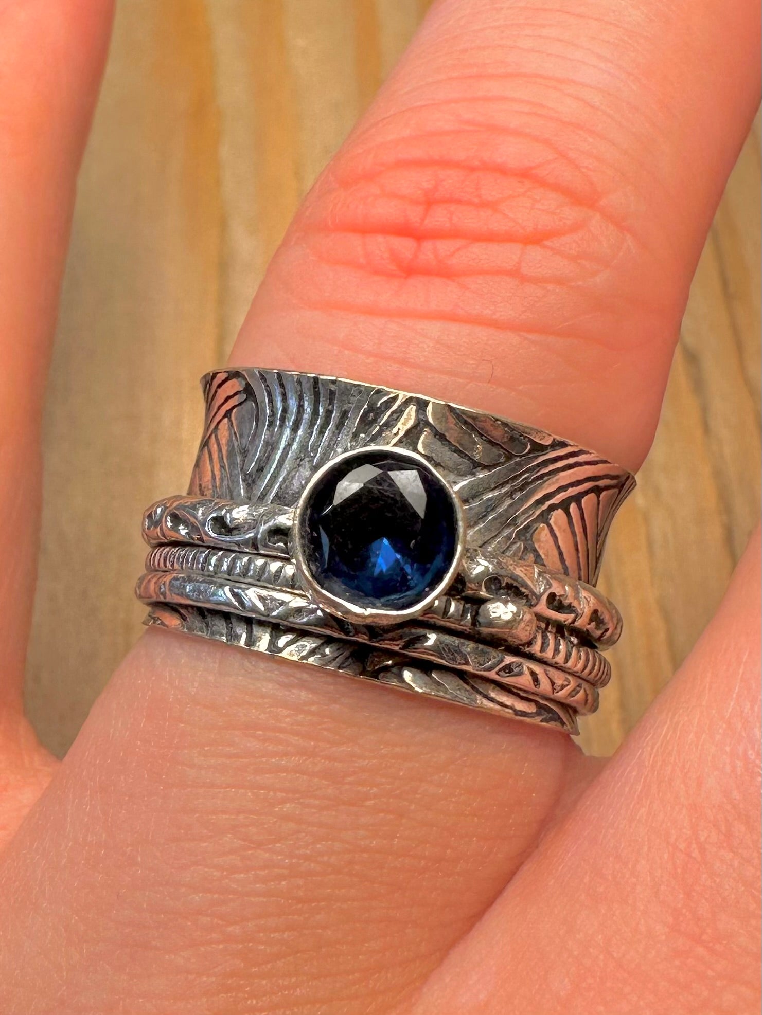 Vintage Blue Stone Engraved Spinner 925 Sterling Silver Size Q Ring