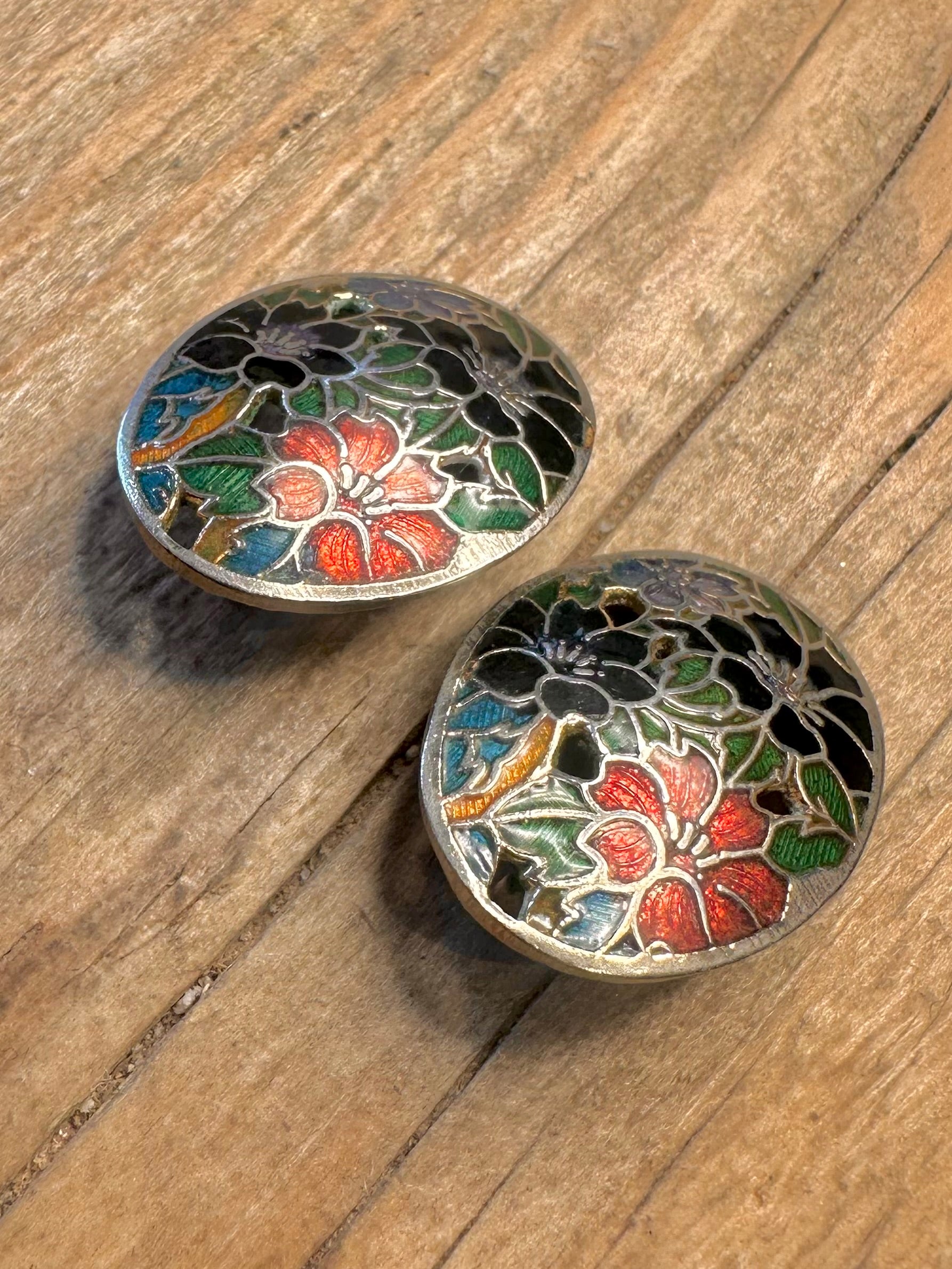 Vintage Cloisonné Enamel Floral Silver Tone Clip On Costume Earrings