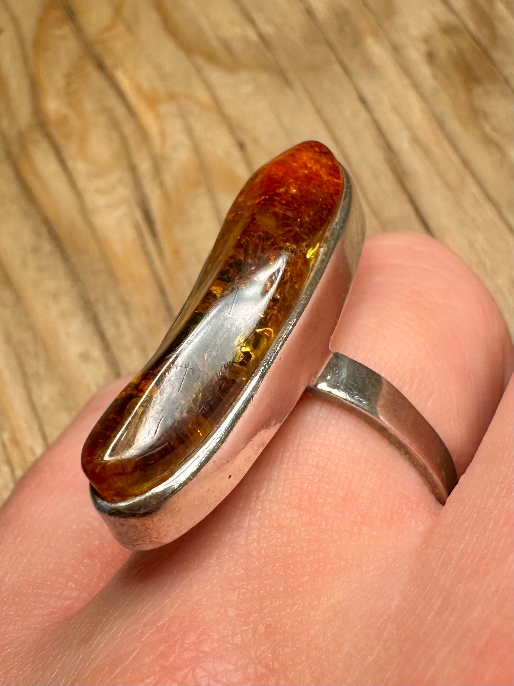 Vintage Elongated Amber 925 Sterling Silver Size P Adjustable Ring