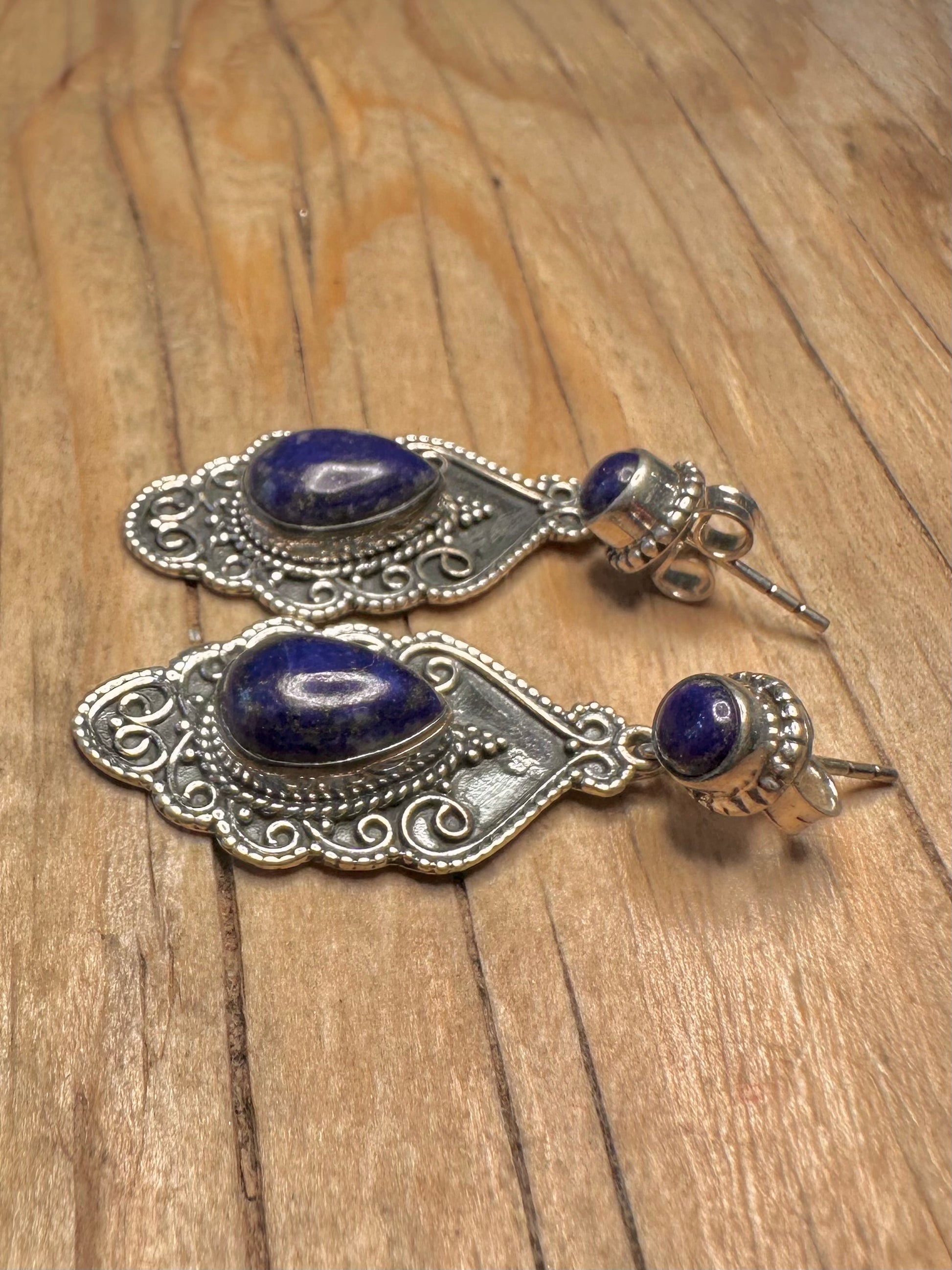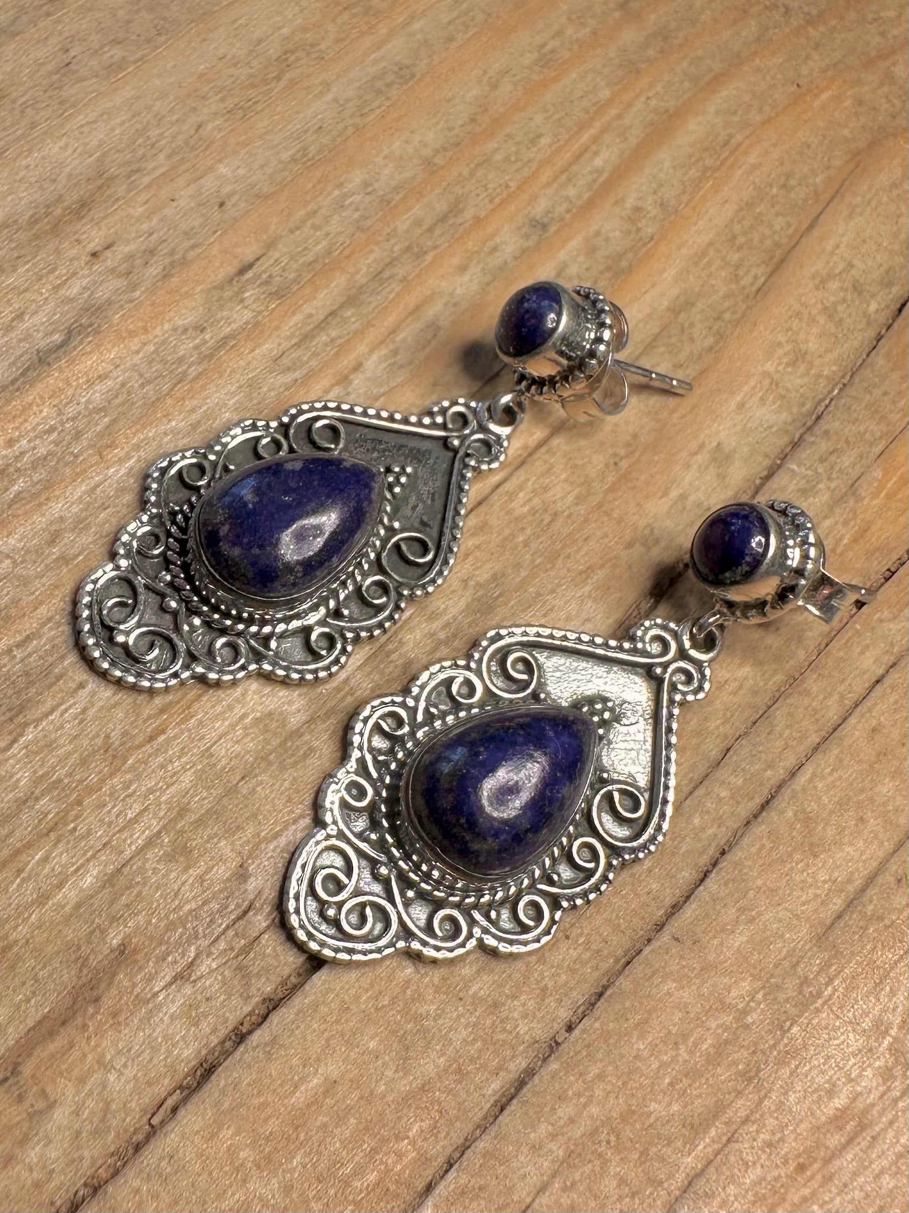 Vintage Lapis Ornate Dangle 925 Sterling Silver Earrings