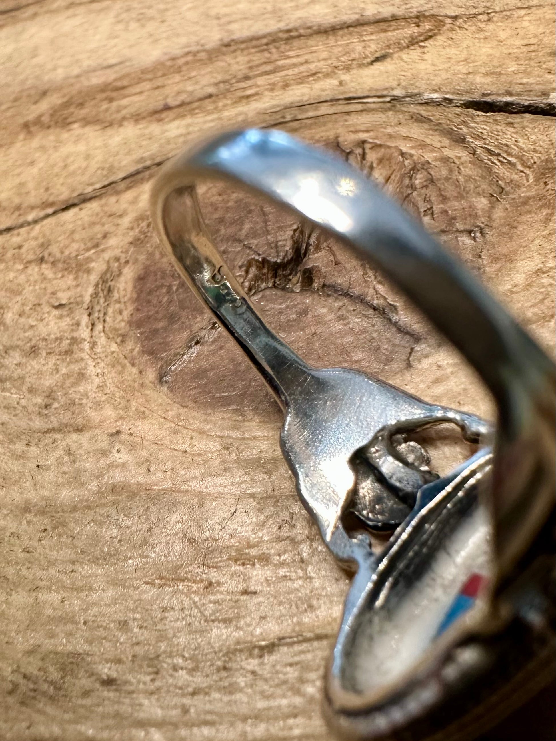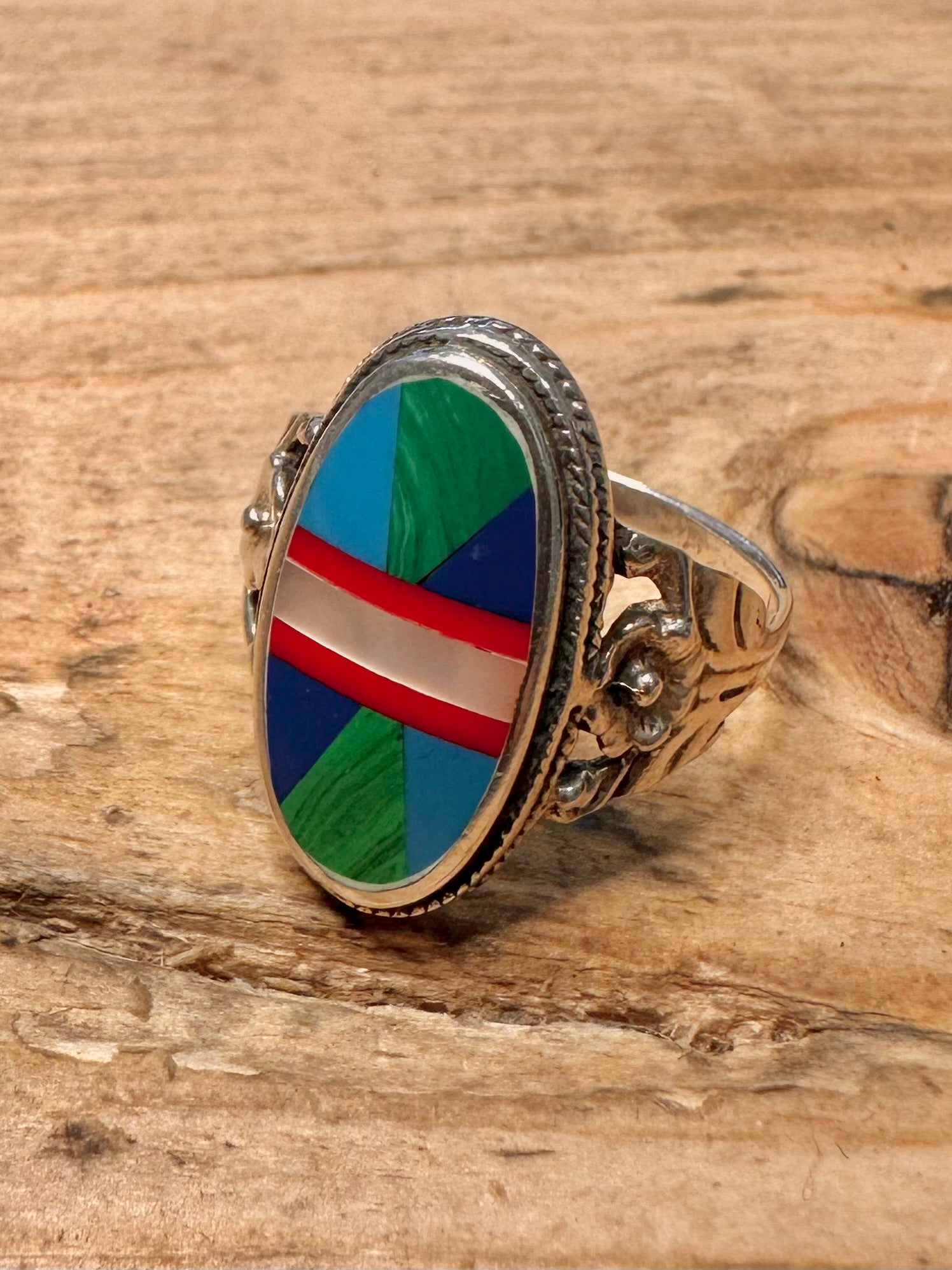 Vintage Mosaic Stones 925 Silver Size Q Ring
