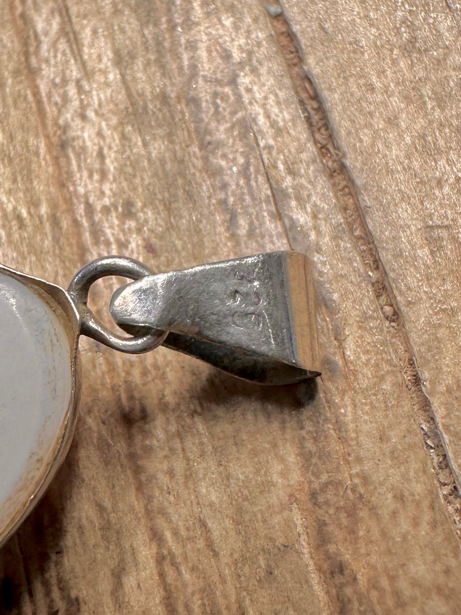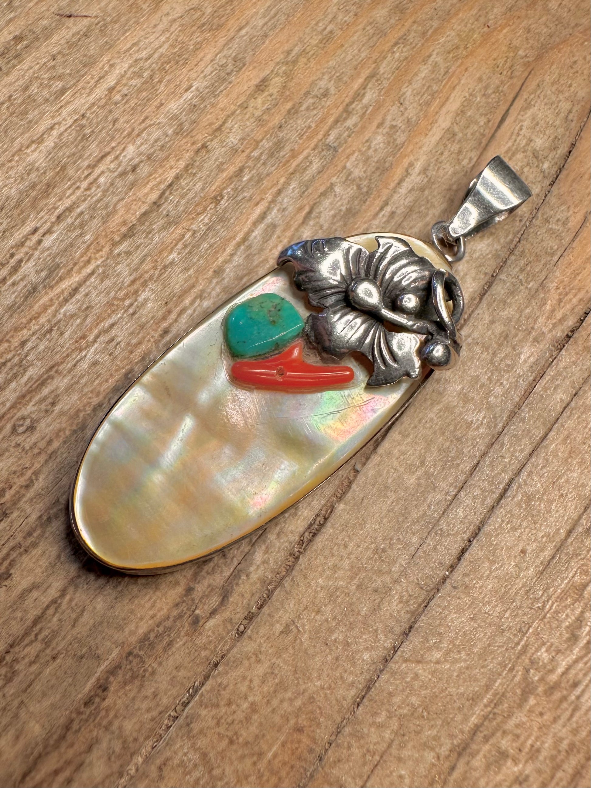 Vintage Native American Mother of Pearl Coral and Turquoise Floral 925 Sterling Silver Pendant