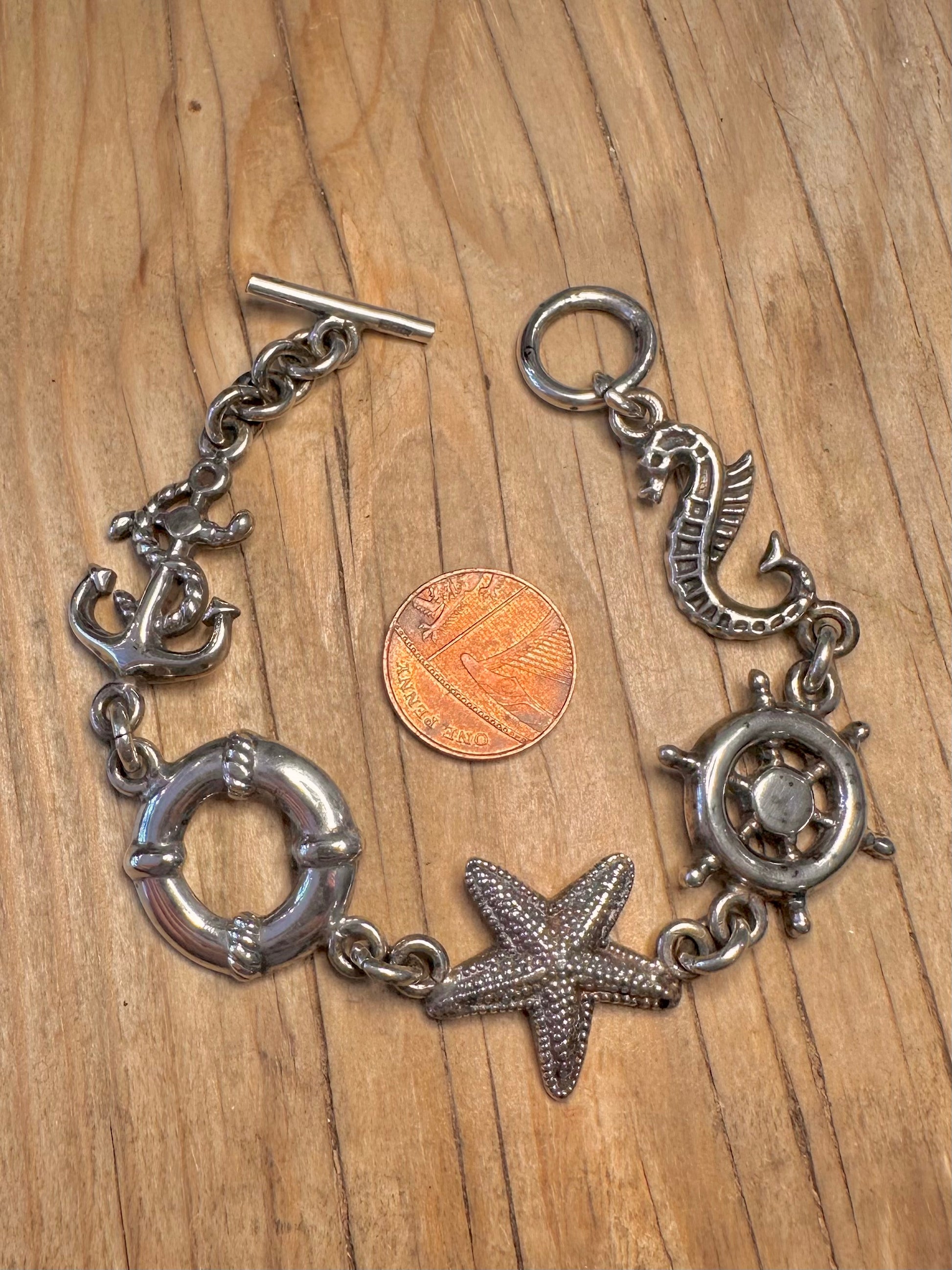 Vintage Nautical Chain Starfish Seahorse Anchor 925 Silver Egyptian 8 inch Bracelet
