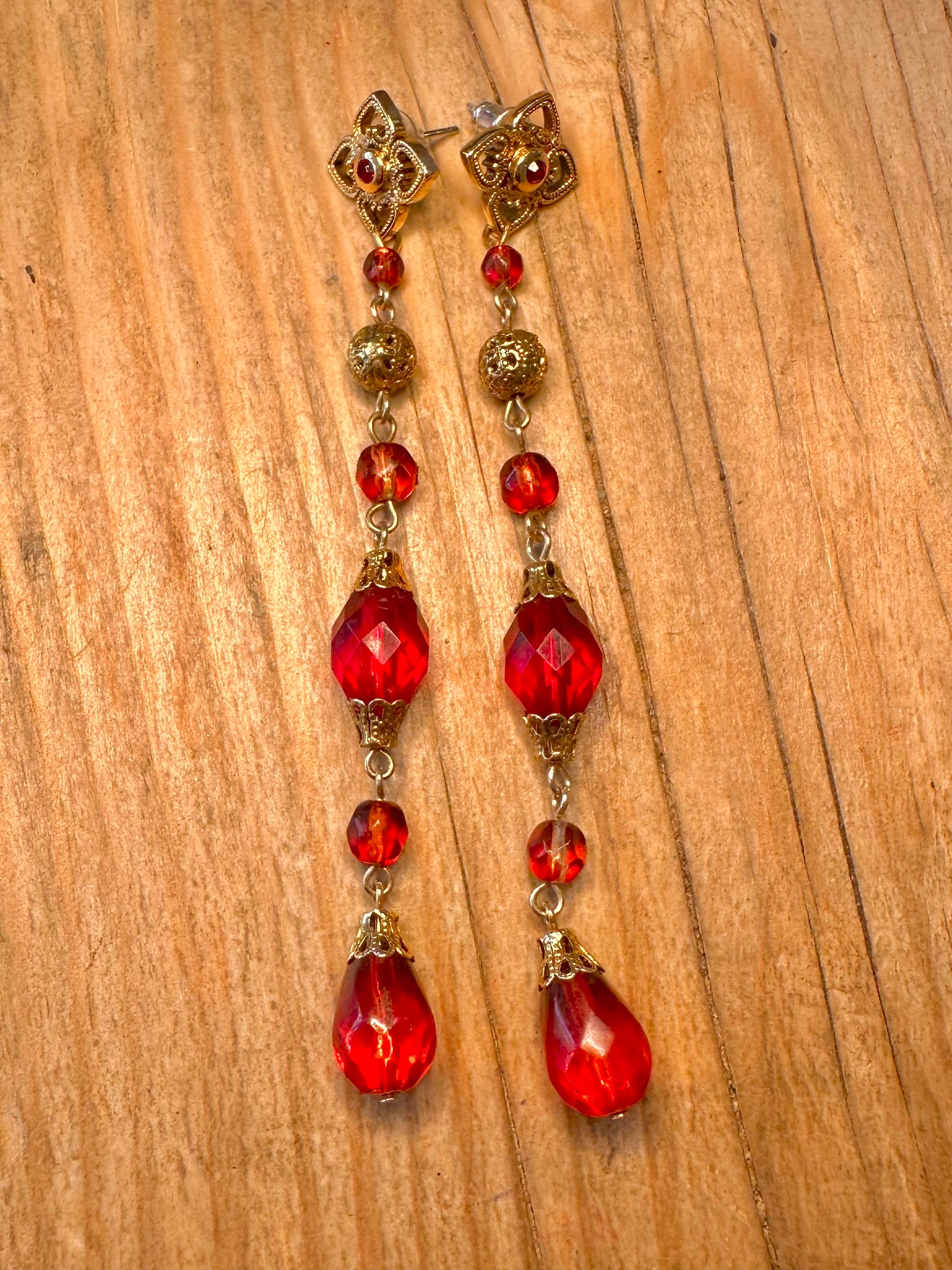 Vintage Red Glass Ornate Dangle Gold Tone Costume Earrings