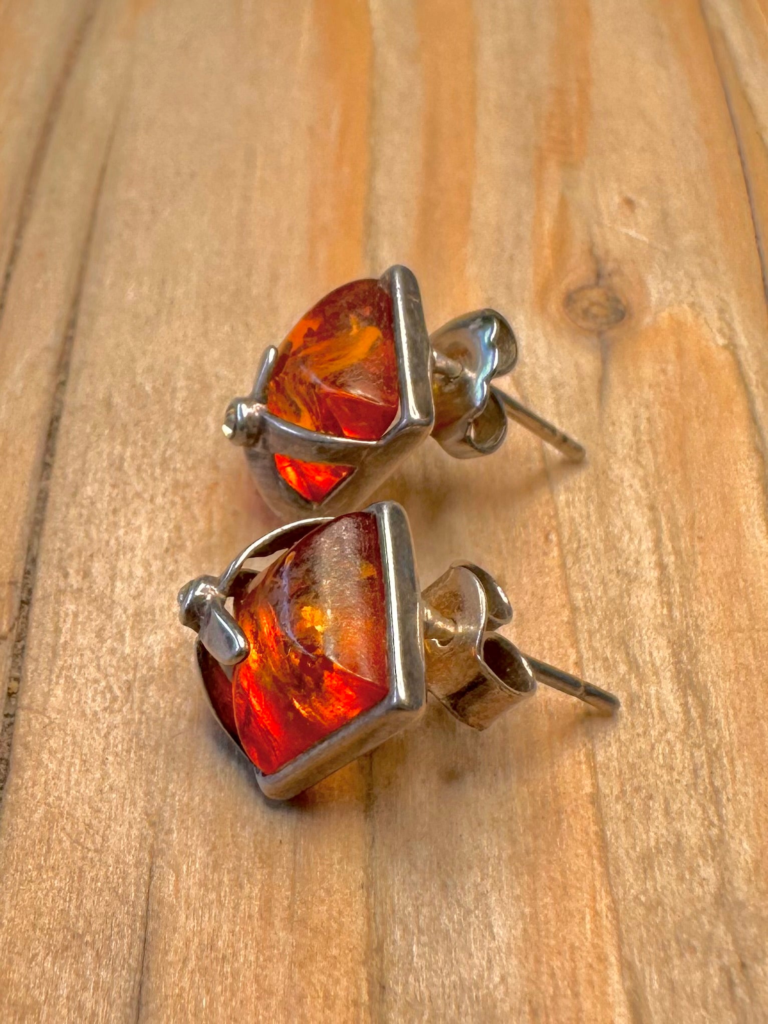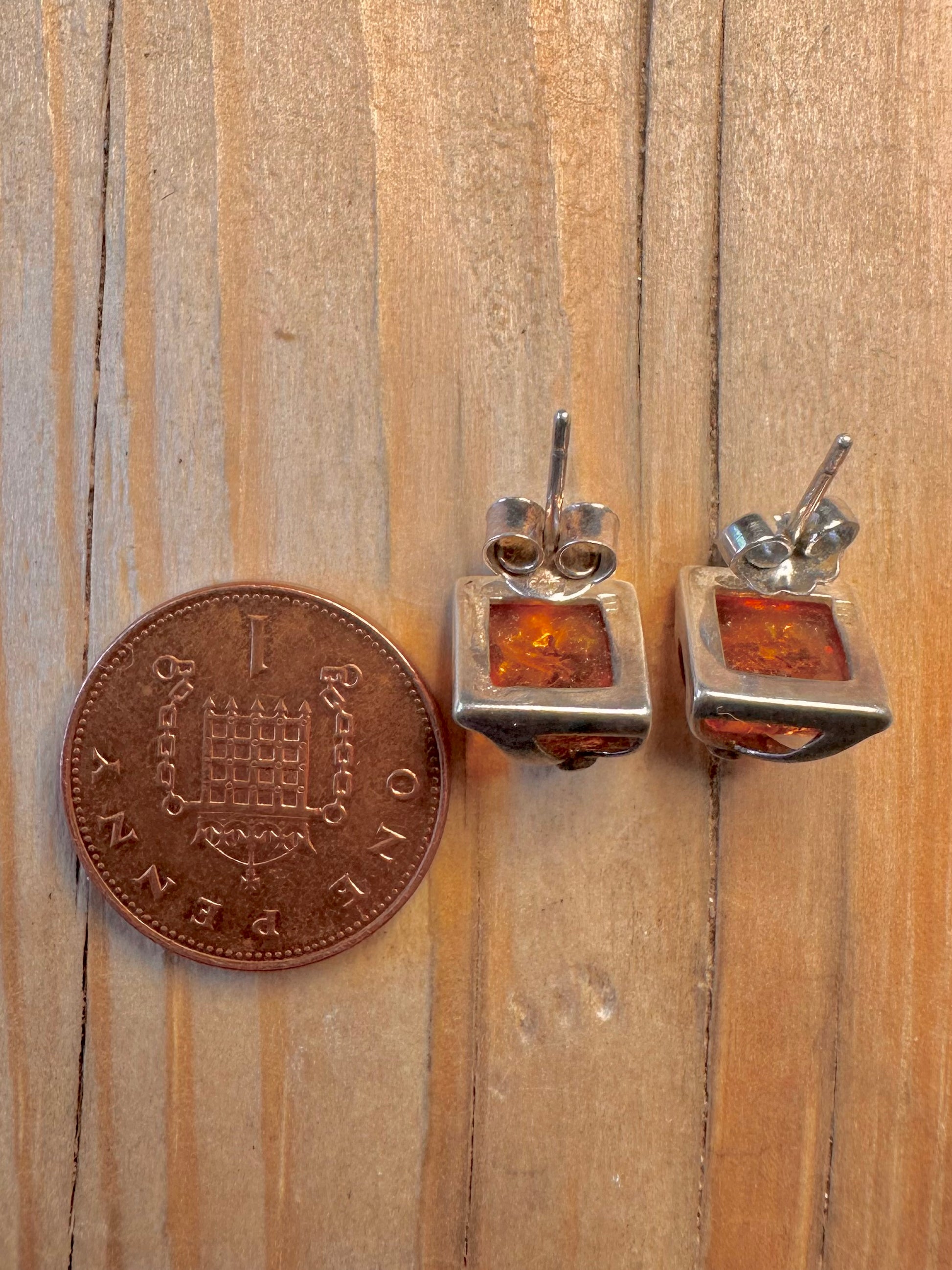 Vintage Square Amber White Stone 925 Sterling Silver Stud Earrings