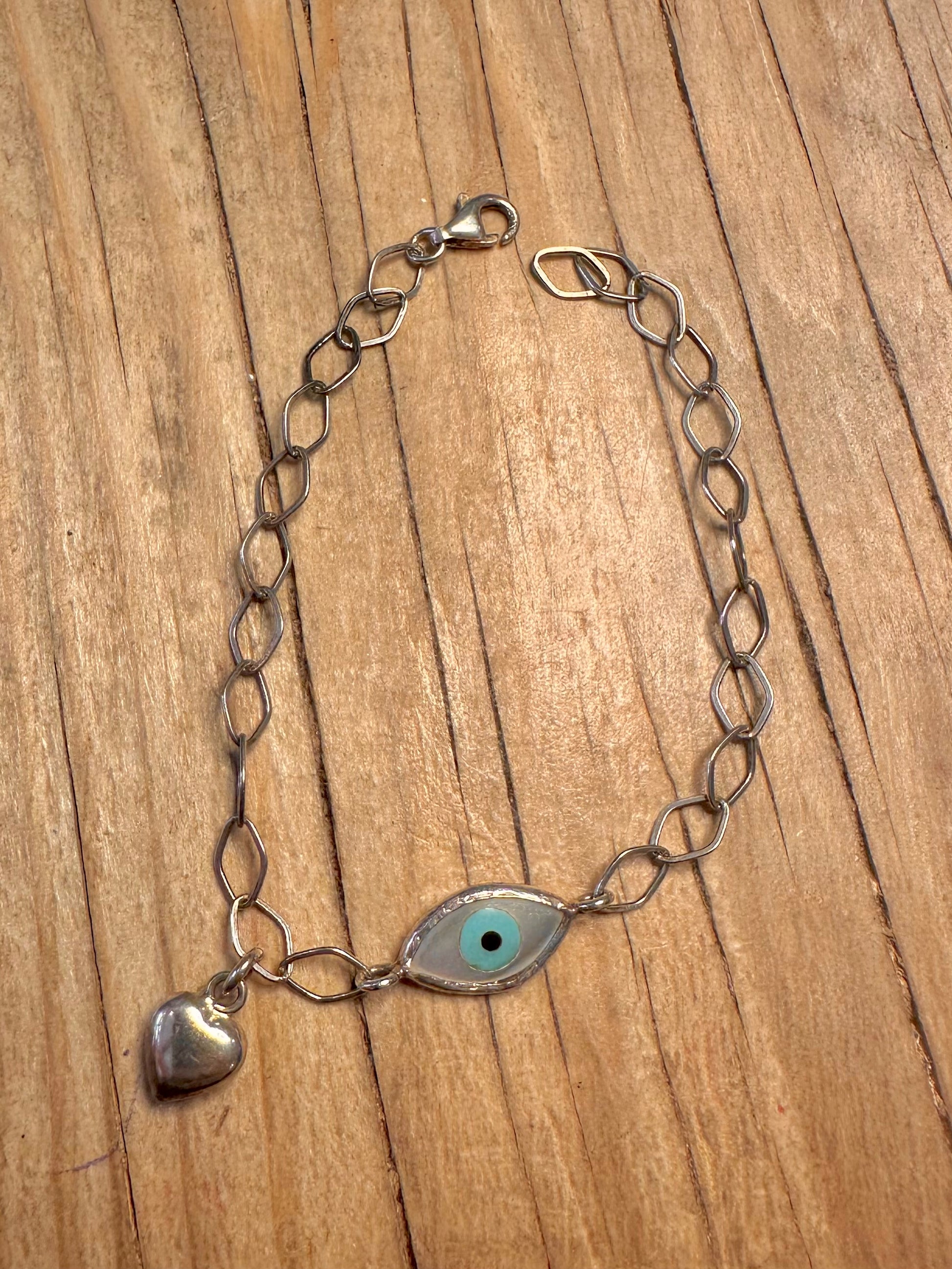 Vintage Unique Chain Evil Eye and Heart Charm 925 Sterling Silver 7.5 inch Bracelet